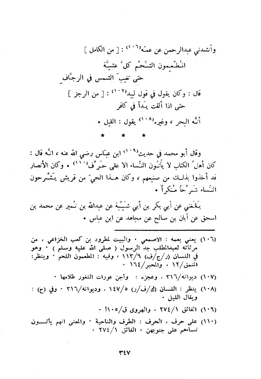 وَقَالَ أَبُو مُحَمَّد فِي حَدِيث ابْن عَبَّاس رَضِي الله عَنهُ انه قَالَ كَانَ أهل الْكتاب لَا يأْتونَ النِّسَاء الا على حرف. وَكَانَ الْأَنْصَار قد أخذُوا بذلك من صنيعهم وَكَانَ هَذَا الْحَيّ من قُرَيْش يشرحون النِّسَاء شرحا مُنْكرا.