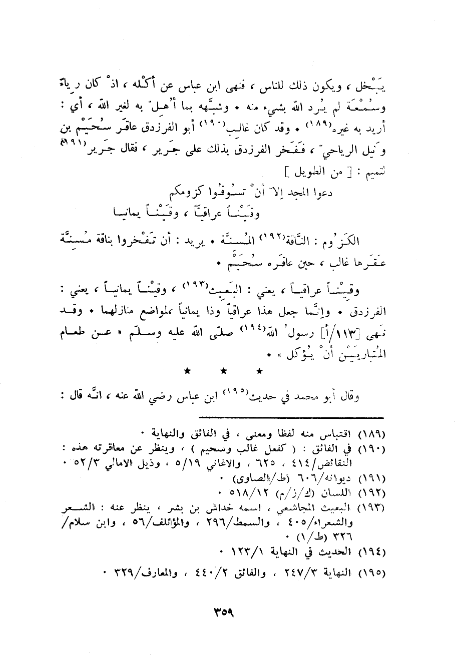 يبخل وَيكون ذَلِك للنَّاس فَنهى ابْن عَبَّاس عَن أكله اذ كَانَ رِيَاء وَسُمْعَة لم يرد الله بِشَيْء مِنْهُ. وَشبهه بِمَا أهل بِهِ لغير الله أَي: أُرِيد بِهِ غَيره. وَقد كَانَ غَالب أَبُو الفرزدق عَاقِر سحيم بن وثيل الريَاحي ففخر الفرزدق بذلك على جرير فَقَالَ جرير لتميم: من الطَّوِيل ... دعوا الْمجد الا أَن تسوقوا كزومكم ... وقينا عراقيا وقينا يَمَانِيا ...