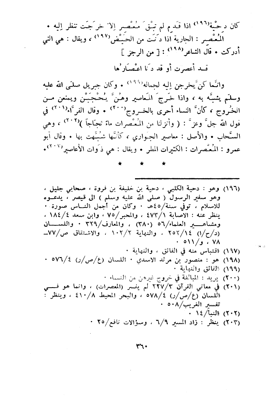 كَانَ دحْيَة اذا قدم لم تبْق معصر الا خرجت تنظر اليه المعصر: الْجَارِيَة اذا دنت من الْحيض وَيُقَال: هِيَ الَّتِي أدْركْت. قَالَ الشَّاعِر: من الرجز ... قد أعصرت أَو قد دنا اعصارها ...