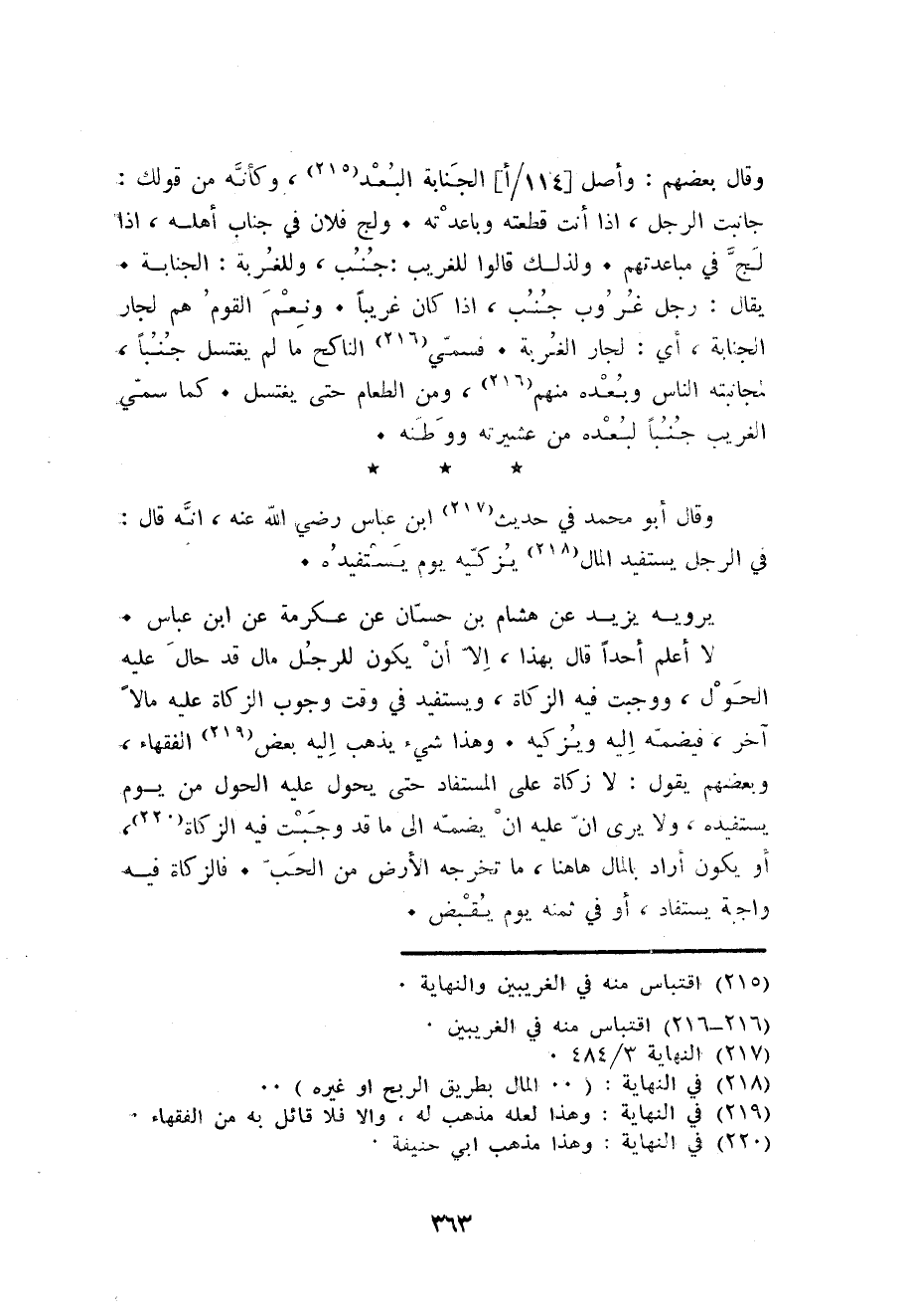 يرويهِ يزِيد عَن هِشَام بن حسان عَن عِكْرِمَة عَن ابْن عَبَّاس. لَا أعلم أحدا قَالَ بِهَذَا الا أَن يكون للرجل مَال قد حَال عَلَيْهِ الْحول وَوَجَبَت فِيهِ الزَّكَاة ويستفيد فِي وَقت وجوب الزَّكَاة عَلَيْهِ مَالا آخر فيضمه اليه ويزكيه. وَهَذَا شَيْء يذهب اليه بعض الْفُقَهَاء وَبَعْضهمْ يَقُول: لَا زَكَاة على الْمُسْتَفَاد حَتَّى يحول عَلَيْهِ الْحول من يَوْم يستفيده وَلَا يرى أَن عَلَيْهِ ان يضمه الى مَا قد وَجَبت فِيهِ الزَّكَاة أَو يكون أَرَادَ بِالْمَالِ هَاهُنَا مَا تخرجه الأَرْض من الْحبّ. فالزكاة فِيهِ وَاجِبَة يُسْتَفَاد اَوْ فِي ثمنه يَوْم يقبض.