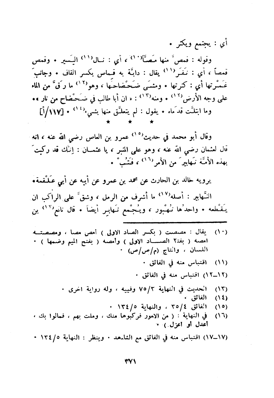 وَقَوله: فمص مِنْهَا مصا أَي: نَالَ الْيَسِير. وقمص قمصا أَي: نفر يُقَال دَابَّة بِهِ قماص بِكَسْر الْقَاف. وجانب غمرتها أَي: كثرتها. وَمَشى ضحضاحها وَهُوَ مَا رق من المَاء على وَجه الأَرْض. وَمِنْه: ان أَبَا طَالب فِي ضحضاح من نَار.