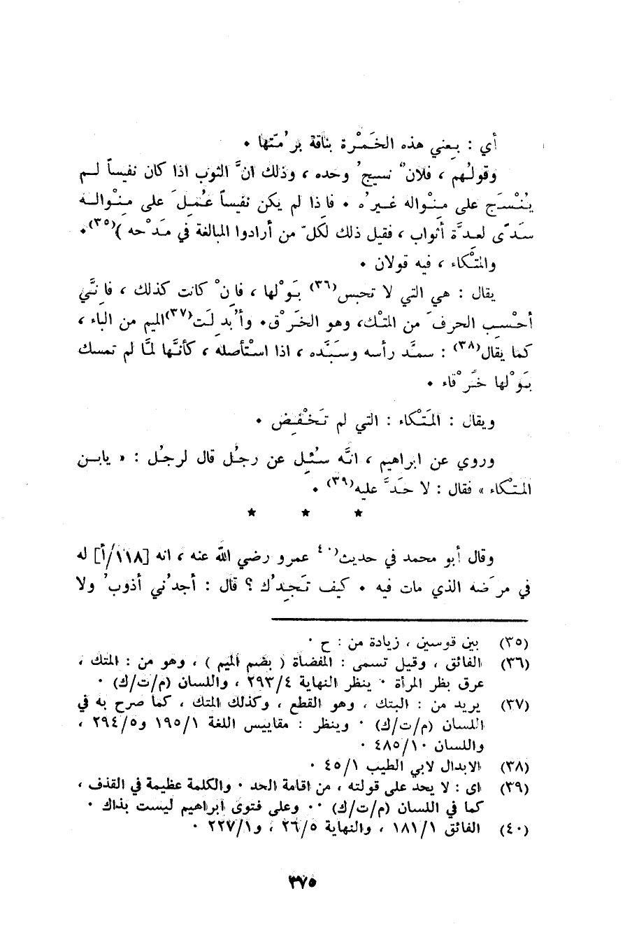 يُقَال: هِيَ الَّتِي لَا تحبس بولها فان كَانَت كَذَلِك فَانِي أَحسب الْحَرْف من المتك وَهُوَ الْخرق. وأبدلت الْمِيم من الْبَاء كَمَا يُقَال:: سمد رَأسه وسبده اذا استأصله كَأَنَّهَا لما لم تمسك بولها خرقاء.