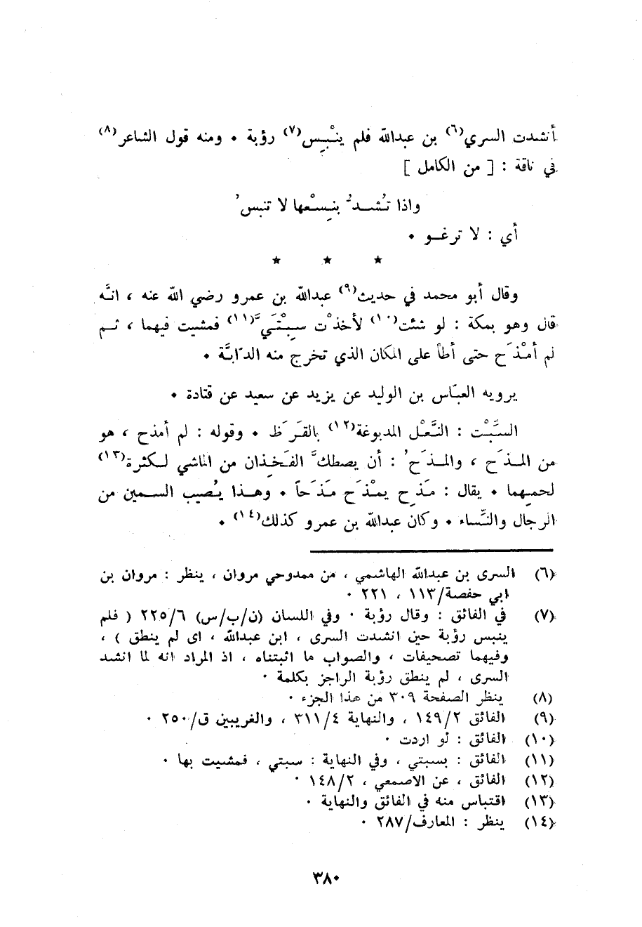 أنشدت السّري بن عبد الله فَلم ينبس رؤبة. وَمِنْه قَول الشَّاعِر فِي نَاقَة: من الْكَامِل ... واذا تشد بنسعها لَا تنبس ...