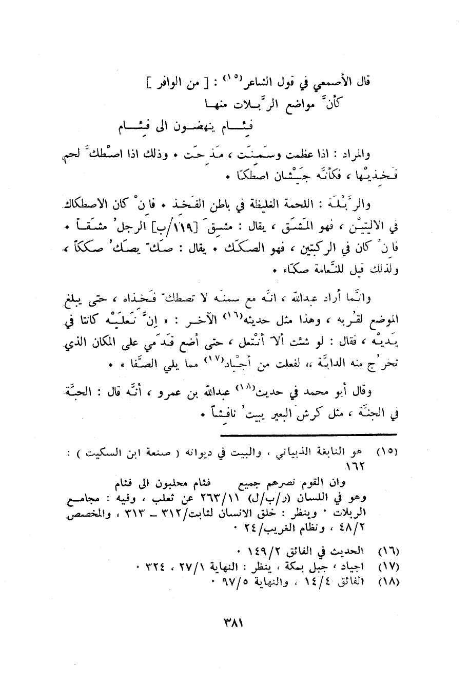 قَالَ الْأَصْمَعِي فِي قَول الشَّاعِر: من الوافر ... كَأَن مَوَاضِع الربلات مِنْهَا ... فِئَام ينهضون الى فِئَام ...