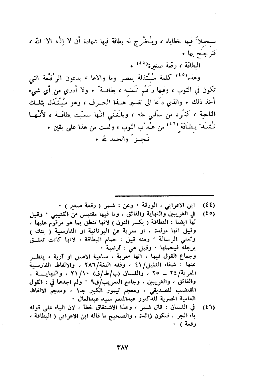 وَهَذِه كلمة مبتذلة بِمصْر وَمَا والاها يدعونَ الرقعة الَّتِي تكون فِي الثَّوْب وفيهَا رقم ثمنه بطاقة. وَلَا أدرى من أَي شىء أَخذ ذَلِك. وَالَّذِي دَعَا الى تَفْسِير هَذَا الْحَرْف وَهُوَ مبتذل بِتِلْكَ النَّاحِيَة كَثْرَة من سَأَلَني عَنهُ وَبَلغنِي انها سميت بطاقة لِأَنَّهَا تشد بطاقة من هدب الثَّوْب وَلست من هَذَا على يَقِين.