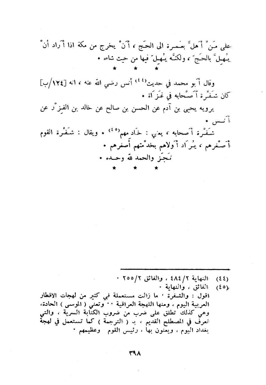 شفرة أَصْحَابه يَعْنِي: خادمهم. وَيُقَال: شفرة الْقَوْم أَصْغَرهم يُرَاد اولاهم بخدمتهم أَصْغَرهم.