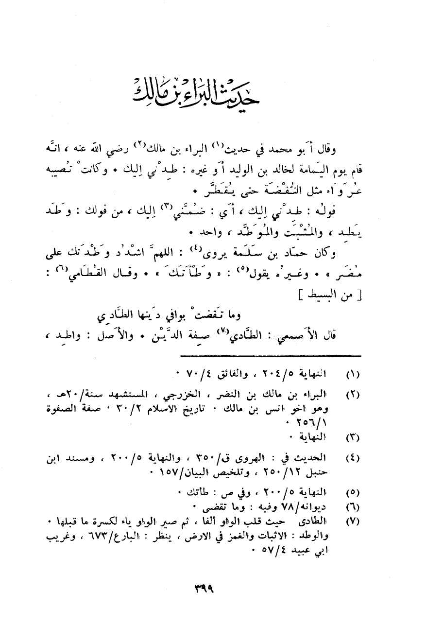 وَقَالَ أَبُو مُحَمَّد فِي حَدِيث الْبَراء بن مَالك رَضِي الله عَنهُ انه قَامَ يَوْم الْيَمَامَة لخَالِد بن الْوَلِيد أَو غَيره: طدني اليك. وَكَانَت تصيبه عرواء مثل النفضة حَتَّى يقطر.