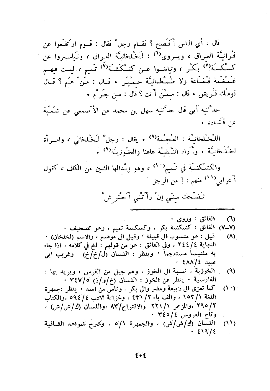 قَالَ: أَي النَّاس أفْصح فَقَامَ رجل فَقَالَ: قوم ارتفعوا عَن فراتية الْعرَاق ويروى: لخلخانية الْعرَاق وتياسروا عَن كسكسة بكر وتيامنوا عَن كشكشة تَمِيم لَيست فيهم غمغمة قضاعة وَلَا طمطمانية حمير. قَالَ: من هم قَالَ: قَوْمك قُرَيْش. قَالَ: مِمَّن أَنْت قَالَ: من جرم.