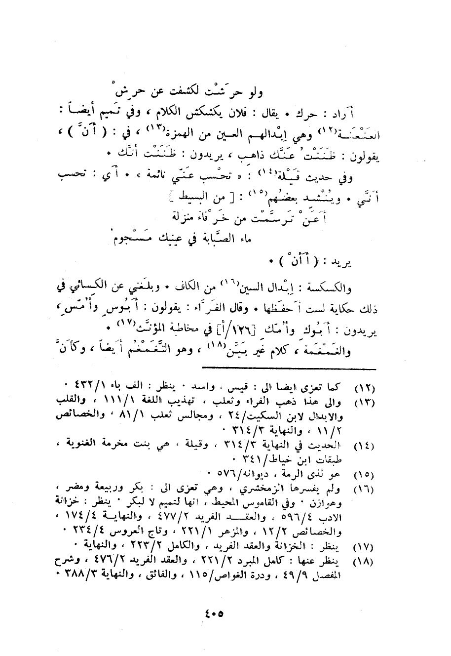 أَرَادَ: حرك. يُقَال: فلَان يكشكش الْكَلَام وَفِي تَمِيم أَيْضا: العنعنة وَهِي ابدالهم الْعين من الْهمزَة فِي: أَن يَقُولُونَ: ظَنَنْت عَنْك ذَاهِب يُرِيدُونَ: ظَنَنْت أَنَّك.