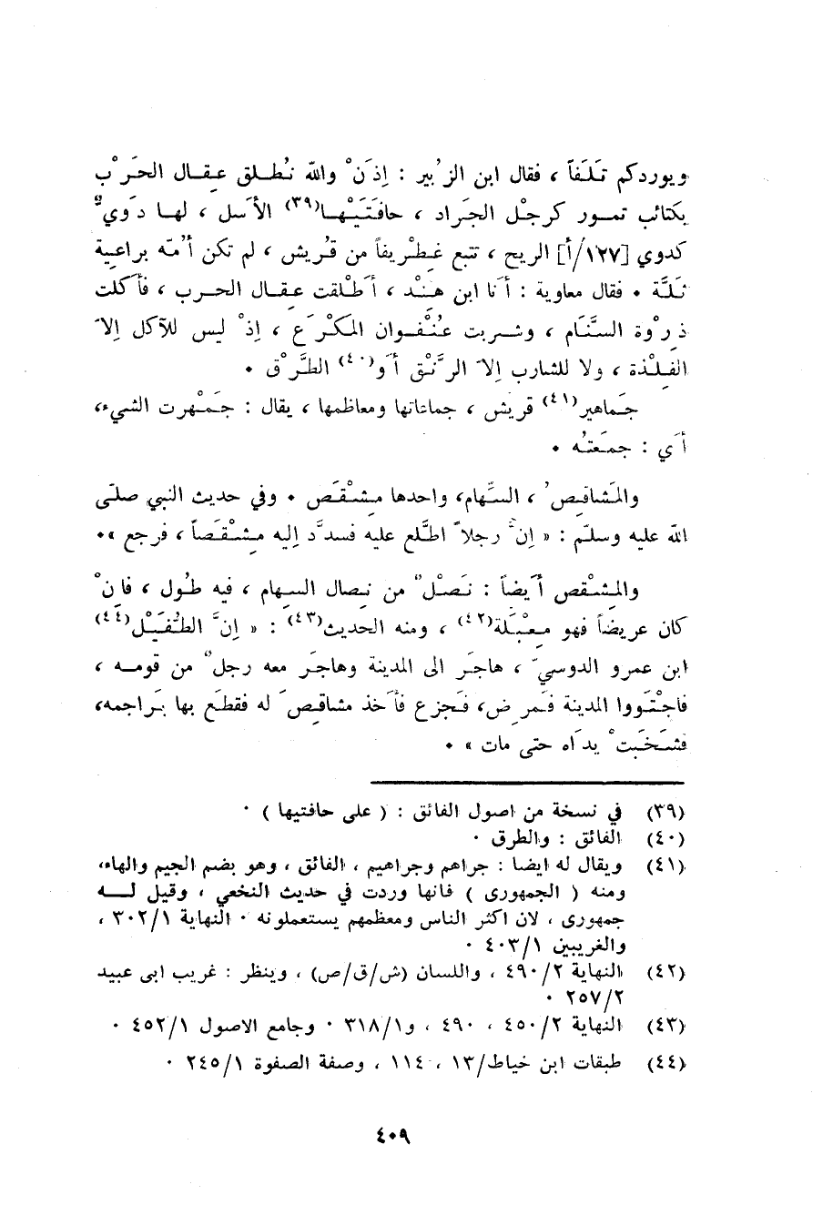 ويوردكم تلفاص فَقَالَ ابْن الزبير: اذن وَالله نطلق عقال الْحَرْب بكتائب تموركرجل الْجَرَاد حافتيها الأسل لَهَا دوِي كَدَوِيِّ الرّيح تتبع غطريفا من قُرَيْش لم تكن أمه براعية ثلة. فَقَالَ مُعَاوِيَة: أَنا ابْن هِنْد أطلقت عقال الْحَرْب المكرم ذرْوَة السنام وشربت عنفوان المكرم اذ لَيْسَ للآكل الا الفلذة وَلَا للشارب الا الرنق أَو الطّرق.
