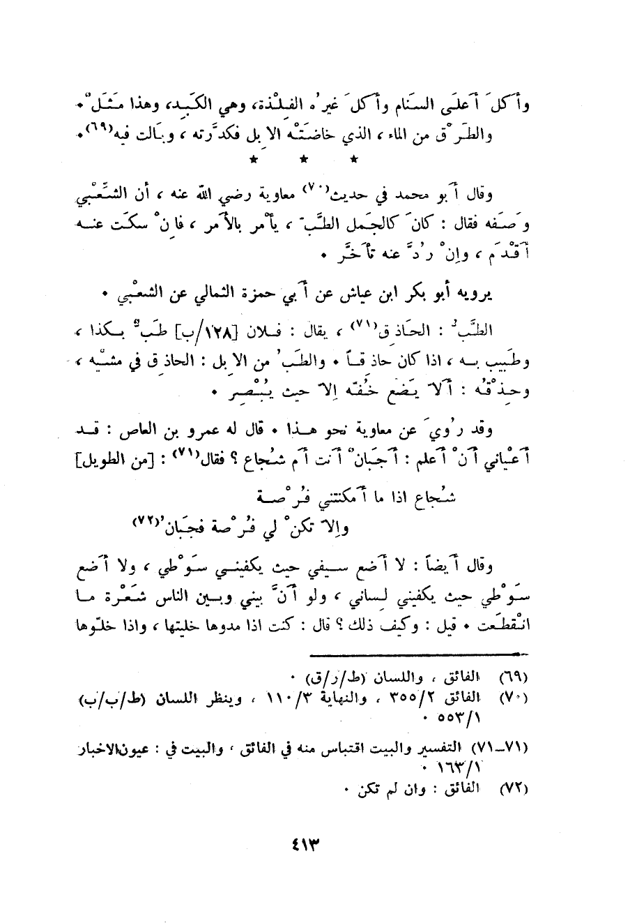 وَقَالَ أَبُو مُحَمَّد فِي حَدِيث مُعَاوِيَة رَضِي الله عَنهُ أَن الشّعبِيّ وَصفه فَقَالَ: كَانَ كَالْجمَلِ الطِّبّ يَأْمر بِالْأَمر فان سكت عَنهُ أقدم وان رد عَنهُ تَأَخّر.