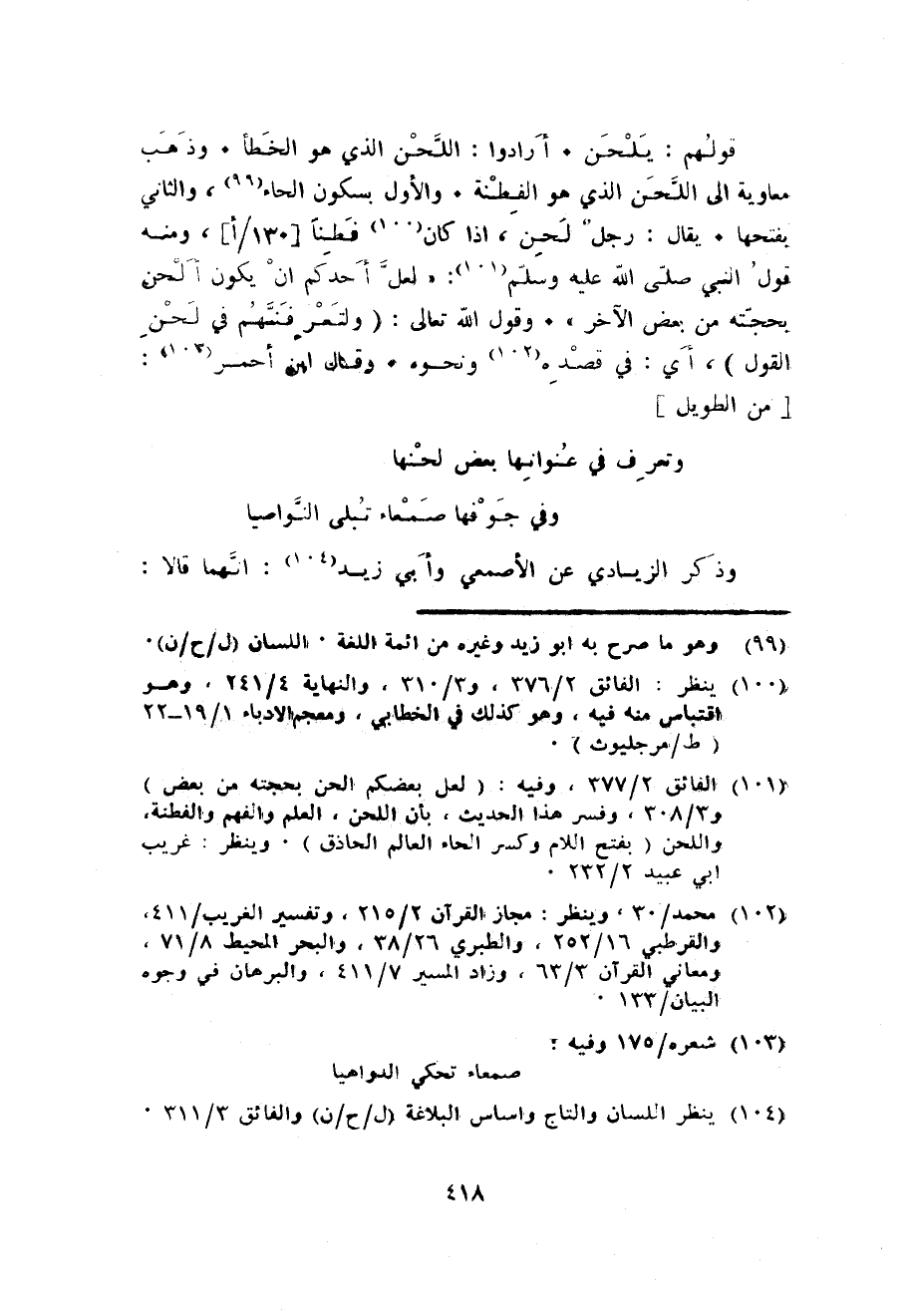 قَوْلهم: يلحن. أَرَادوا: اللّحن الَّذِي هُوَ الْخَطَأ. وَذهب مُعَاوِيَة الى اللّحن الَّذِي هُوَ الفطنة. وَالْأول بِسُكُون الْحَاء وَالثَّانِي بِفَتْحِهَا. يُقَال: رجل لحن اذاكان فطنا وَمِنْه قَول النبى صلى الله عَلَيْهِ وَسلم: لَعَلَّ أحدكُم أَن يكون أَلحن بحجته من بعض الآخر. وَقَول الله تَعَالَى: {ولتعرفنهم فِي لحن القَوْل} أَي: فِي قَصده وَنَحْوه. وَقَالَ ابْن أَحْمَر: من الطَّوِيل ... وتعرف فِي عنوانها بعض لحنها ... وَفِي جوفها صمعاء تبلى النواصيا ...