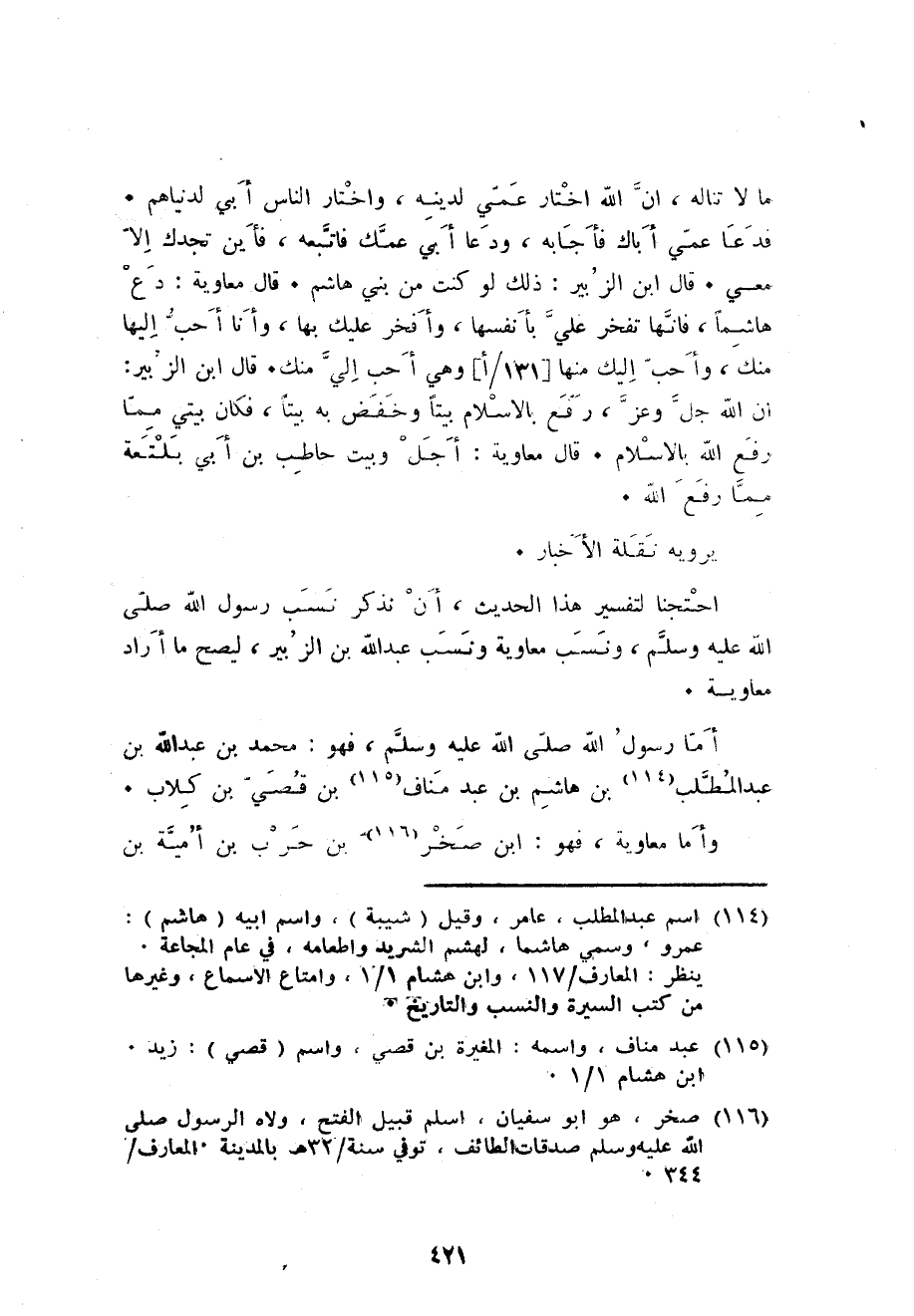 احتجنا لتفسير هَذَا الحَدِيث أَن نذْكر نسب رَسُول الله صلى الله عَلَيْهِ وَسلم وَنسب مُعَاوِيَة وَنسب عبد الله بن الزبير ليَصِح مَا أَرَادَ مُعَاوِيَة.