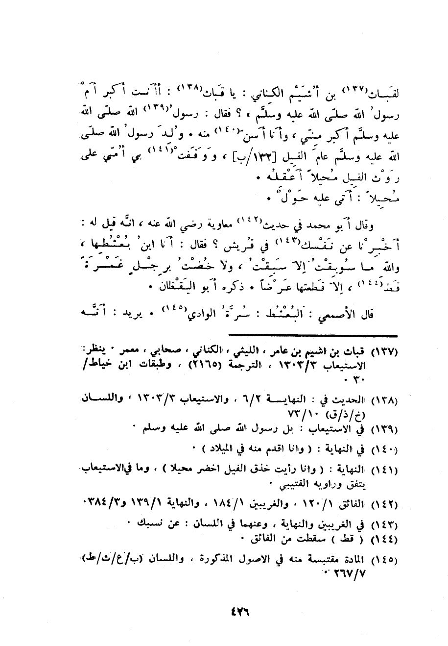 لقباث بن أَشْيَم الْكِنَانِي: يَا قباث: أَأَنْت أكبر أم رَسُول الله صلى الله عَلَيْهِ وَسلم: فَقَالَ: رَسُول الله صلى الله عَلَيْهِ وَسلم أكبر مني وَأَنا أسن مِنْهُ. ولد رَسُول الله صلى الله عَلَيْهِ وَسلم عَام الْفِيل ووقفت بِي أمتِي على رَوْث الْفِيل محيلا أعقله.