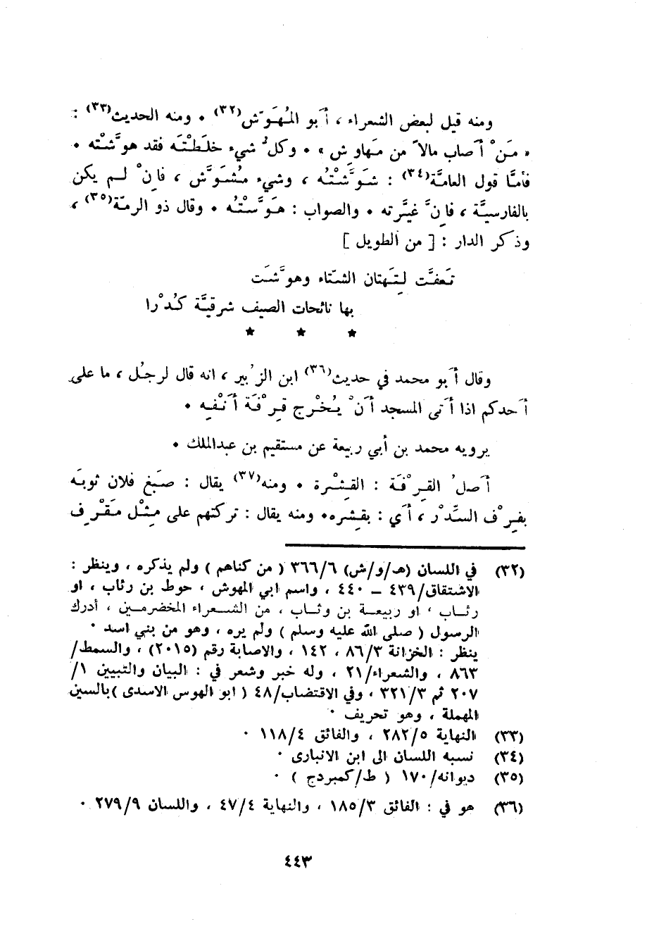 وَمِنْه قيل لبَعض الشُّعَرَاء أَبُو المهوش. وَمِنْه الحَدِيث: من أصَاب مَالا من مهاوش. وكل شىء خلطته فقد هوشته. فَأَما قَول الْعَامَّة: شوشته وَشَيْء مشوش فان لم يكن بِالْفَارِسِيَّةِ فان غيرته. وَالصَّوَاب: هوسته. وَقَالَ ذُو الرمة وَذكر الدَّار: من الطَّوِيل ... تعفت لتهتان الشتَاء وهوشت ... بهَا نائحات الصَّيف شرقية كدرا ...