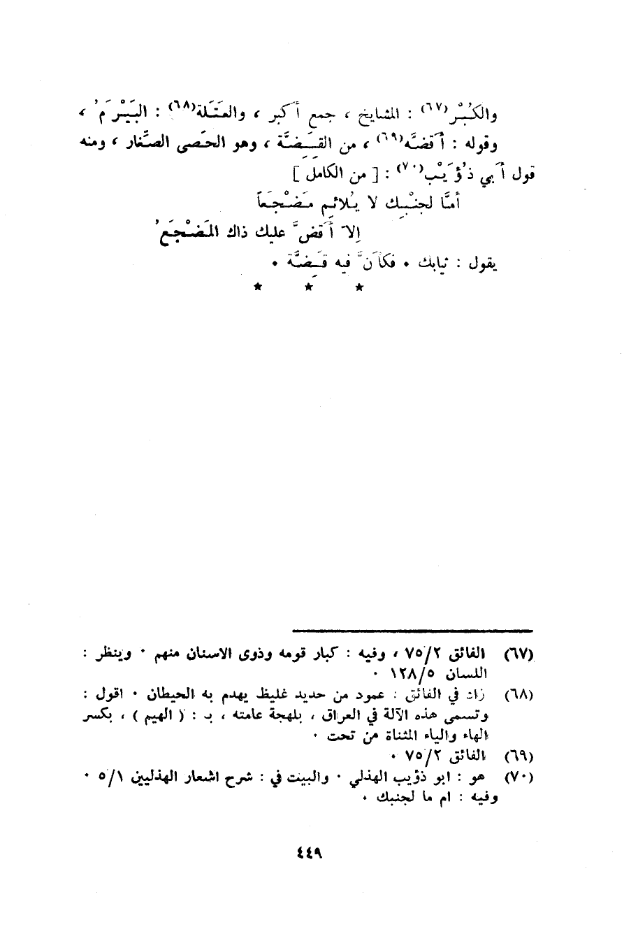 وَالْكبر: الْمَشَايِخ جمع أكبر والعتلة: البيرم وَقَوله: أقضه من القضة وَهُوَ الْحَصَى الصغار وَمِنْه قَول أبي ذُؤَيْب: من الْكَامِل ... أما لجنبك لَا يلائم مضجعا ... الا أقض عَلَيْك ذَاك المضجع ...