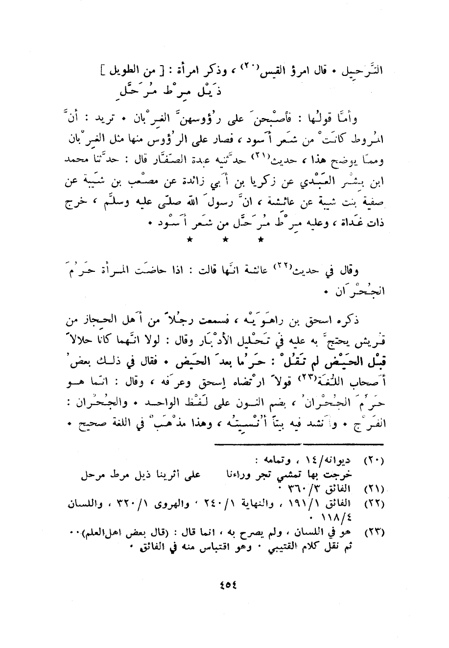 ذكره اسحق بن رَاهَوَيْه فَسمِعت رجلا من أهل الْحجاز من قُرَيْش يحْتَج بِهِ عَلَيْهِ فِي تَحْلِيل الأدبار وَقَالَ: لَوْلَا انهما كَانَا حَلَالا قبل الْحيض لم تقل: حرما بعد الْحيض. فَقَالَ فِي ذَلِك بعض أَصْحَاب اللُّغَة قولا ارْتَضَاهُ اسحق وعرفه وَقَالَ: انما هُوَ حرم الجحران بِضَم النُّون على لفظ الْوَاحِد. والجحران: الْفرج. وانشد فِيهِ بَيْتا أنسيته وَهَذَا مَذْهَب فِي اللُّغَة صَحِيح.
