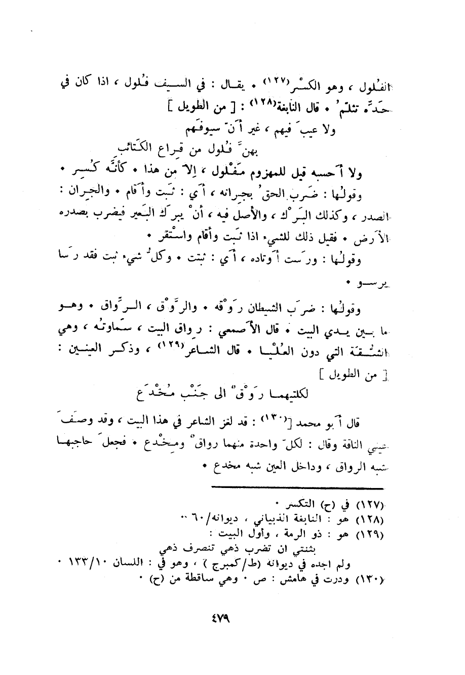 الفلول وَهُوَ الْكسر. يُقَال: فِي السَّيْف فلول اذا كَانَ فِي حَده تثلم. قَالَ النَّابِغَة: من الطَّوِيل ... وَلَا عيب فيهم غير أَن سيوفهم ... بِهن فلول من قراع الْكَتَائِب ...