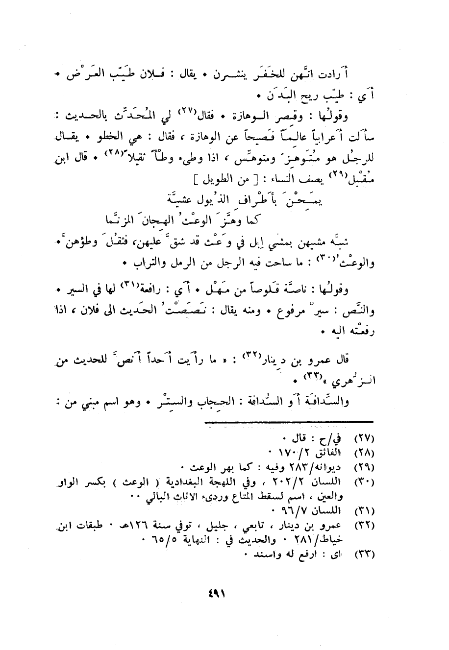وَقَوْلها: وَقصر الوهازة. فَقَالَ لي الْمُحدث بِالْحَدِيثِ: سَأَلت أَعْرَابِيًا عَالما فصيحا عَن الوهازة فَقَالَ: هِيَ الخطو. يُقَال للرجل هُوَ متوهز ومتوهس اذا وطىء وطأ ثقيلا. قَالَ ابْن مقبل يصف النِّسَاء: من الطَّوِيل ... يمحن بأطراف الذيول عَشِيَّة ... كَمَا وهز الوعث الهجان المزنما ...