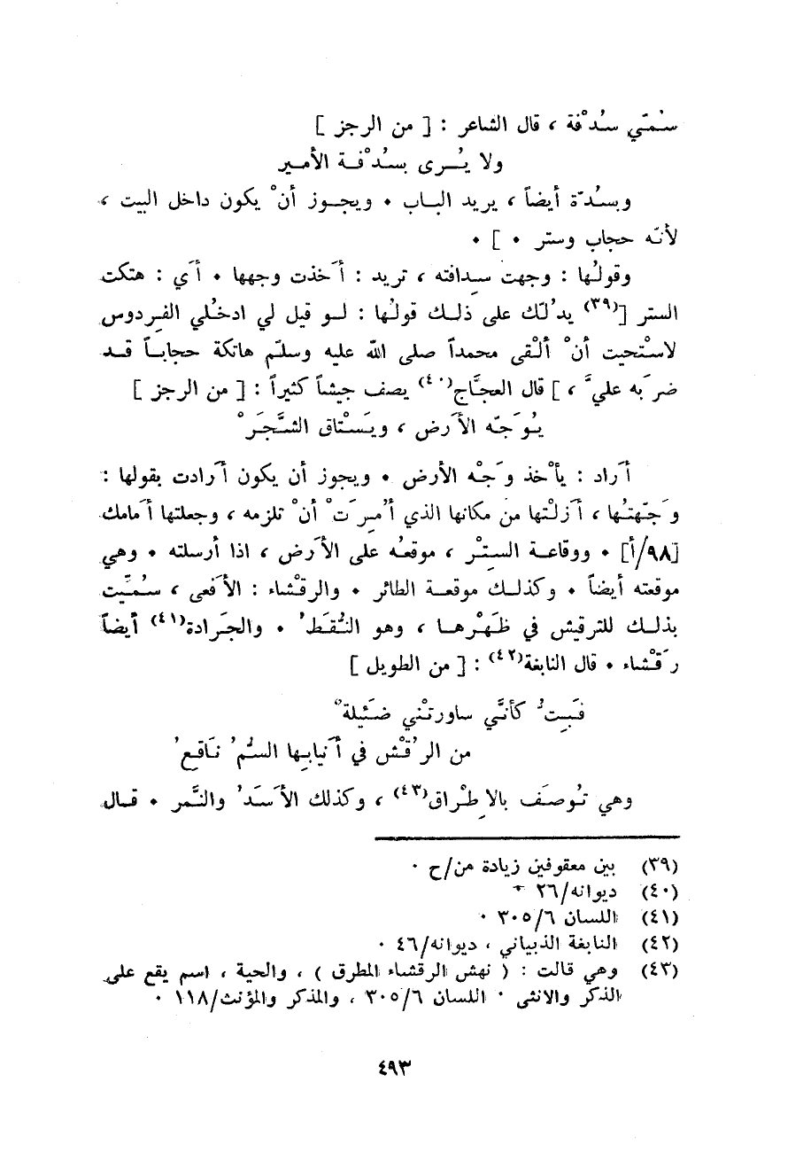 وَقَوْلها: وجهت سدافته تُرِيدُ: أخذت وَجههَا. أَي: هتكت السّتْر يدلك على ذَلِك قَوْلهَا: لَو قيل لي ادخلي الفردوس لاستحيت أَن ألْقى مُحَمَّدًا صلى الله عَلَيْهِ وَسلم هاتكة حِجَابا قد ضربه عَليّ قَالَ العجاج يصف جَيْشًا كثيرا: من الرجز ... يُوَجه الأَرْض ويستاق الشّجر ...