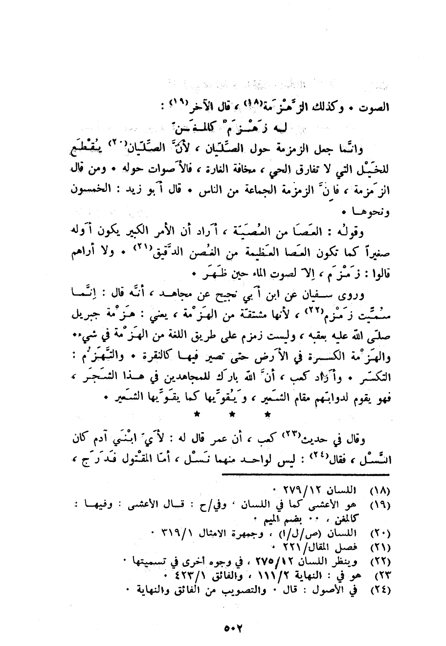 وروى سُفْيَان عَن ابْن أبي نجيح عَن مُجَاهِد أَنه قَالَ: انما سميت زَمْزَم لِأَنَّهَا مُشْتَقَّة من الهزمة يَعْنِي: هزمة جِبْرِيل صلى الله عَلَيْهِ بعقبه وَلَيْسَت زَمْزَم على طَرِيق اللُّغَة من الهزمة فِي شَيْء. والهزمة الكسرة فِي الأَرْض حَتَّى تصير فِيهَا كالنقرة. والتهزم: التكسر. وَأَرَادَ كَعْب أَن الله بَارك للمجاهدين فِي هَذَا الشّجر فَهُوَ يقوم لدوابهم مقَام الشّعير ويقويها كَمَا يقويها الشّعير.