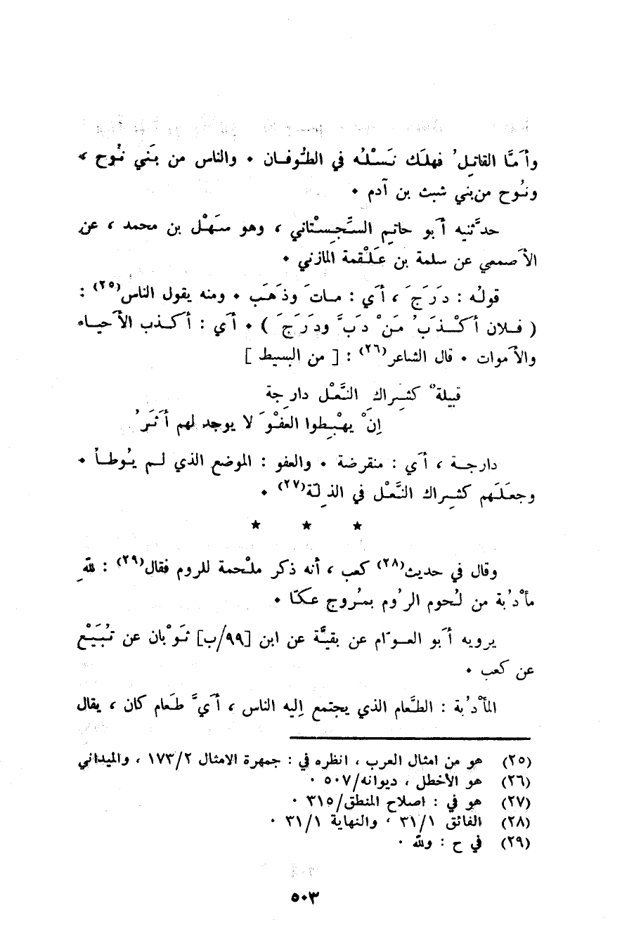 قَوْله: درج أَي: مَاتَ وَذهب. وَمِنْه يَقُول النَّاس: فلَان أكذب من دب ودرج. أَي: أكذب الْأَحْيَاء والأموات. قَالَ الشَّاعِر: من الْبَسِيط ... قَبيلَة كشراك النَّعْل دارجة ... ان يهبطوا الْعَفو لَا يُوجد لَهُم أثر ...