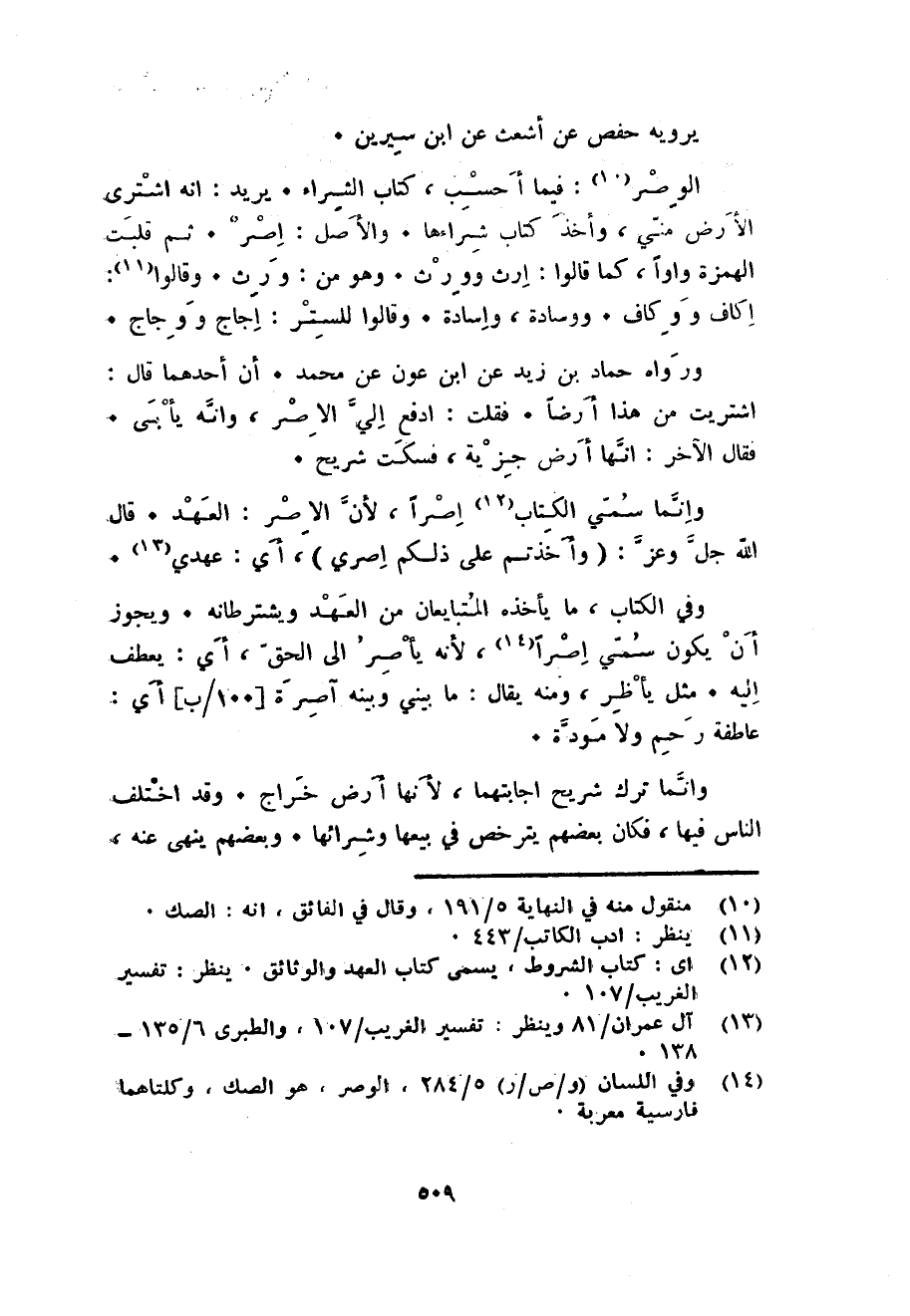الوصر: فِيمَا أَحسب كتاب الشِّرَاء. يُرِيد: انه اشْترى الأَرْض مني وَأخذ كتاب شراءها وَالْأَصْل: اصر. ثمَّ قلبت الْهمزَة واوا كَمَا قَالُوا: ارث وَورث. وَهُوَ من: ورث. وَقَالُوا اكاف ووكاف. ووسادة. واسادة. وَقَالُوا للستر: اجاج ووجاج.