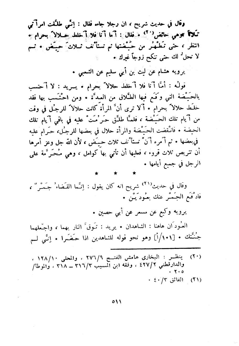 وَقَالَ فِي حَدِيث شُرَيْح ان رجلا جَاءَهُ فَقَالَ: اني طلقت امْرَأَتي تلافا وَهِي حَائِض. فَقَالَ: أما أَنا فَلَا أخلط حَلَالا بِحرَام.