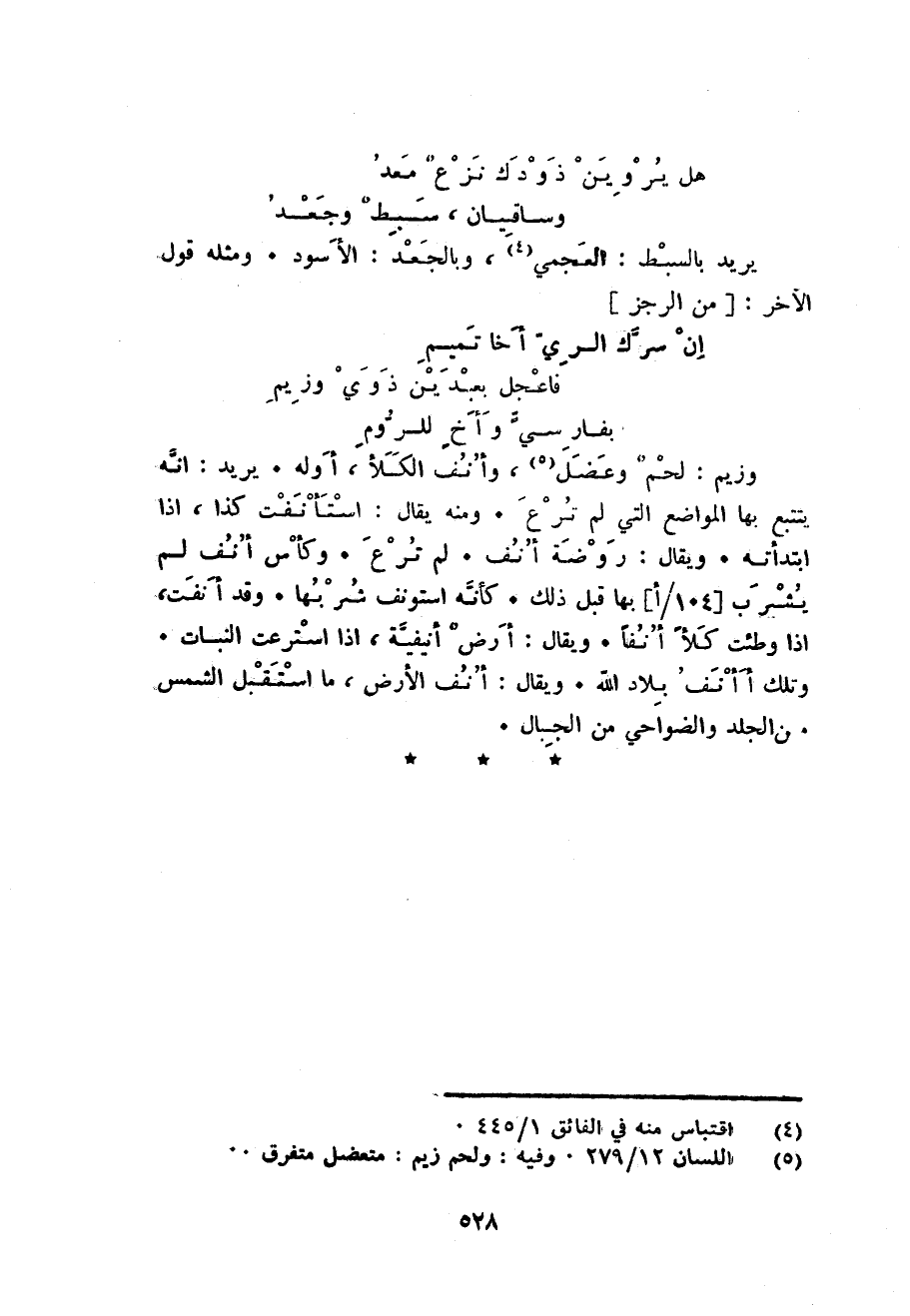 وزيم: لحم وعضل وأنف الكلا أَوله. يُرِيد: انه يتتبع بهَا الْمَوَاضِع الَّتِي لم ترع. وَمِنْه يُقَال: استأنفت كَذَا اذا ابتدأته. وَيُقَال: رَوْضَة أنف. لم ترع. وكأس أنف لم يشرب بهَا قبل ذَلِك. كَأَنَّهُ استونف شربهَا. وَقد أنفت اذا وطِئت كلأ أنفًا. وَيُقَال: أَرض أنيفية اذا استرعت النَّبَات. وَتلك أانف بِلَاد الله. وَيُقَال: أنف الأَرْض مَا اسْتقْبل الشَّمْس من الْجلد والضواحي من الْجبَال.