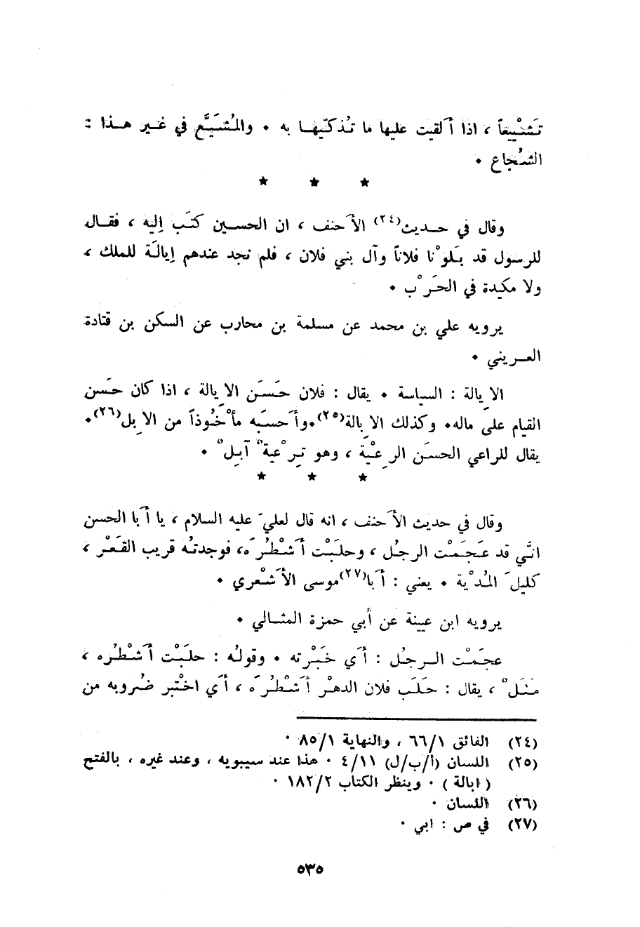 وَقَالَ فِي حَدِيث الْأَحْنَف انه قَالَ لعَلي عَلَيْهِ السَّلَام يَا أَبَا الْحسن اني قد عجمت الرجل وحلبت أشطره فَوَجَدته قريب القعر كليل المدية. يَعْنِي: أَبَا مُوسَى الْأَشْعَرِيّ.