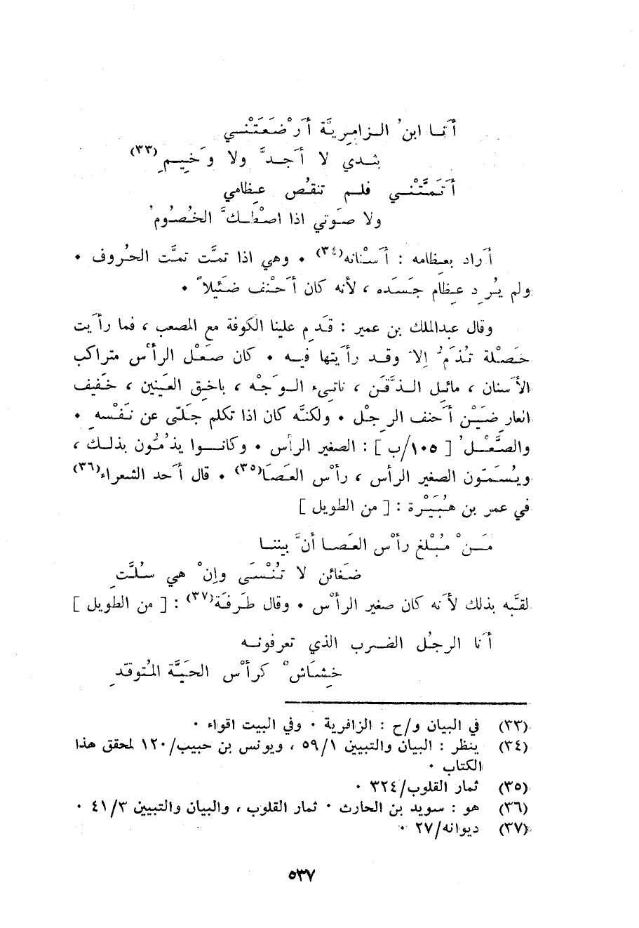 وَقَالَ عبد الملك بن عُمَيْر: قدم علينا الْكُوفَة مَعَ المصعب فَمَا رَأَيْت خصْلَة تذم الا وَقد رَأَيْتهَا فِيهِ. كَانَ صعل الرَّأْس متراكب الْأَسْنَان مائل الذقن ناتىء الْوَجْه باخق الْعَينَيْنِ خَفِيف العارضين أحنف الرجل. وَلكنه كَانَ اذا تكلم جلى عَن نَفسه. والصعل: الصَّغِير الرَّأْس. وَكَانُوا يذمون بذلك ويسمون الصَّغِير الرَّأْس رَأس الْعَصَا. قَالَ أحد الشُّعَرَاء فِي عمر بن هُبَيْرَة: من الطَّوِيل ... من مبلغ رَأس الْعَصَا أَن بَيْننَا ... ضغائن لَا تنسى وان هِيَ سلت ...