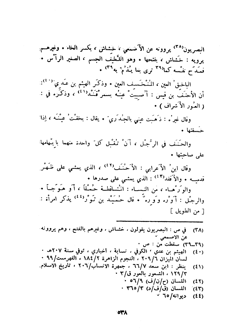 البصريون يَرْوُونَهُ عَن الْأَصْمَعِي خشَاش بِكَسْر الْخَاء وَغَيرهم يرويهِ: خشَاش بِفَتْحِهَا وَهُوَ اللَّطِيف الْجِسْم الصَّغِير الرَّأْس. فمدح نَفسه كَمَا ترى بِمَا يذم بِهِ.