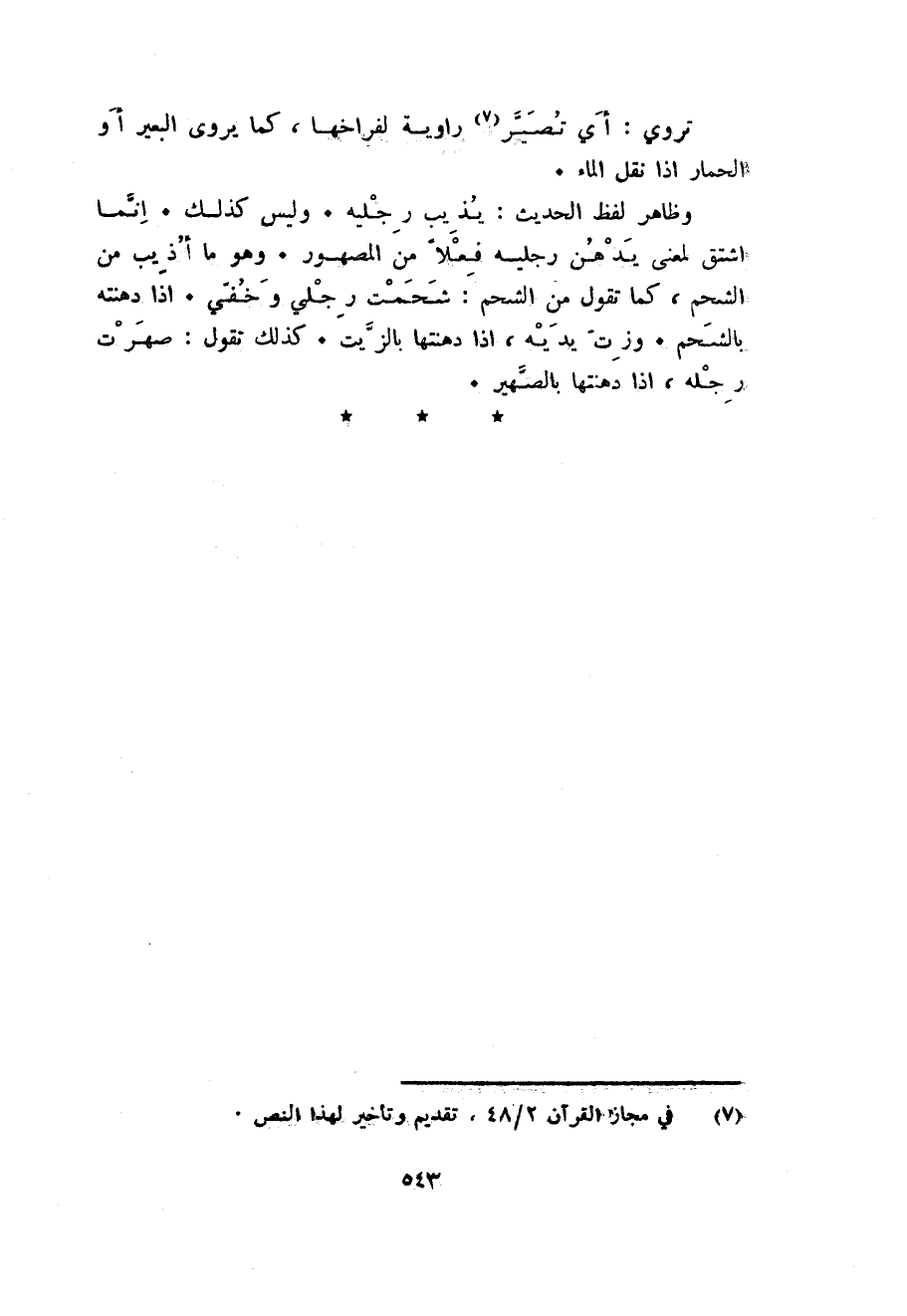 وَظَاهر لفظ الحَدِيث: يذيب رجلَيْهِ. وَلَيْسَ كَذَلِك. انما اشتق لِمَعْنى يدهن رجلَيْهِ فعلا من المصهور. وَهُوَ مَا أذيب من الشَّحْم كَمَا تَقول من الشَّحْم: شحمت رجْلي وخفي. اذا دهنته بالشحم. وزت يَدَيْهِ اذا دهنتها بالزيت. كَذَلِك تَقول: صهرت رجله اذا دهنتها بالصهير.