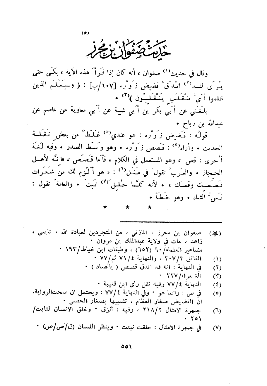 وَقَالَ فِي حَدِيث صَفْوَان أَنه كَانَ اذا قَرَأَ هَذِه الْآيَة بَكَى حَتَّى يرى لقد اندق قضيض زوره: {وَسَيعْلَمُ الَّذين ظلمُوا أَي مُنْقَلب يَنْقَلِبُون} .