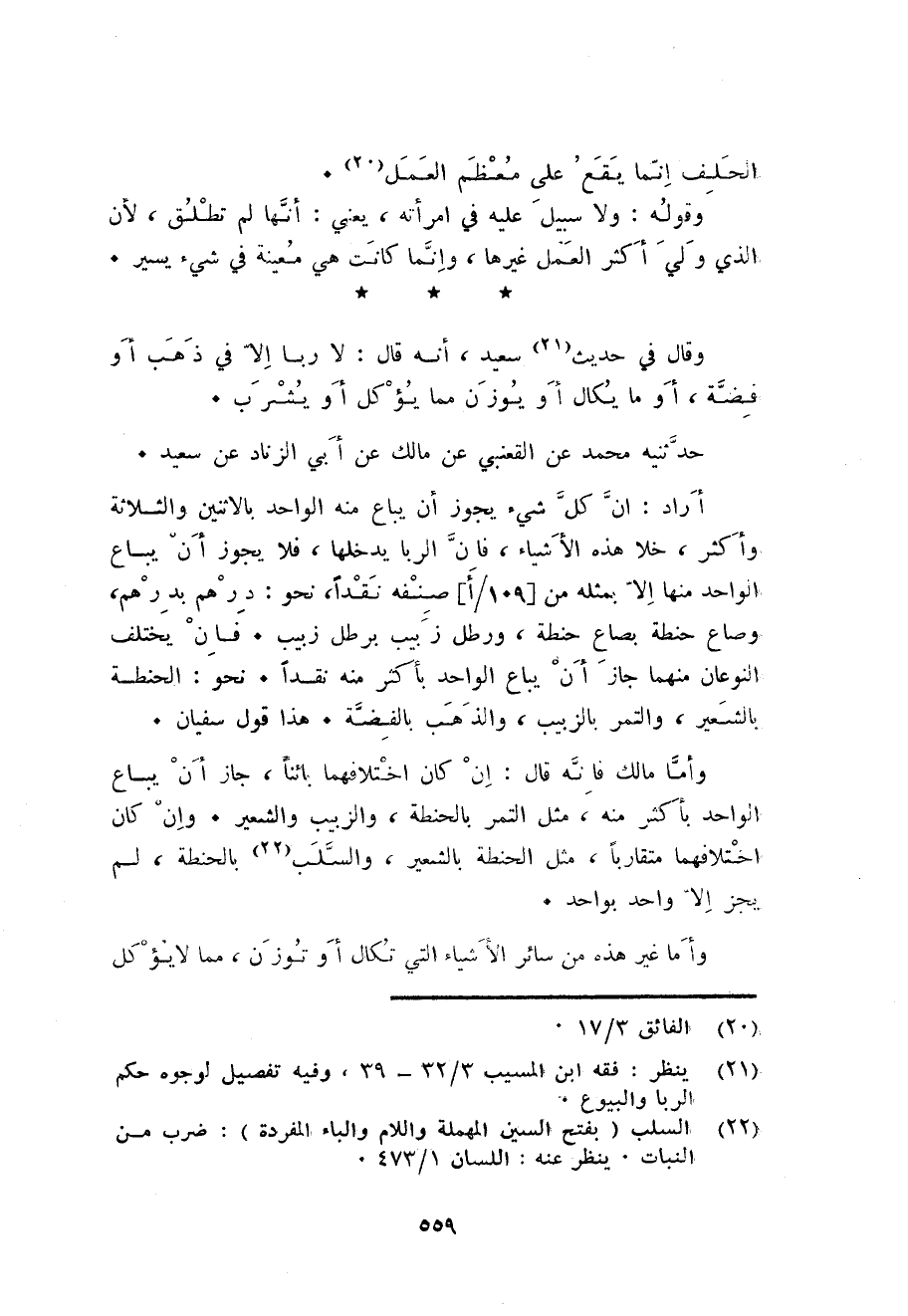 أَرَادَ: ان كل شَيْء يجوز أَن يُبَاع مِنْهُ الْوَاحِد بالاثنين وَالثَّلَاثَة وَأكْثر خلا هَذِه الْأَشْيَاء فان الرِّبَا يدخلهَا فَلَا يجوز أَن يُبَاع الْوَاحِد مِنْهَا الا بِمثلِهِ من صنفه نَقْدا نَحْو: دِرْهَم بدرهم وَصَاع حِنْطَة بِصَاع حِنْطَة ورطل زبيب برطل زبيب فان يخلتف النوعان مِنْهُمَا جَازَ أَن يُبَاع الْوَاحِد بِأَكْثَرَ مِنْهُ نَقْدا. نَحْو الْحِنْطَة بِالشَّعِيرِ وَالتَّمْر بالزبيب وَالذَّهَب بِالْفِضَّةِ. هَذَا قَول سُفْيَان.