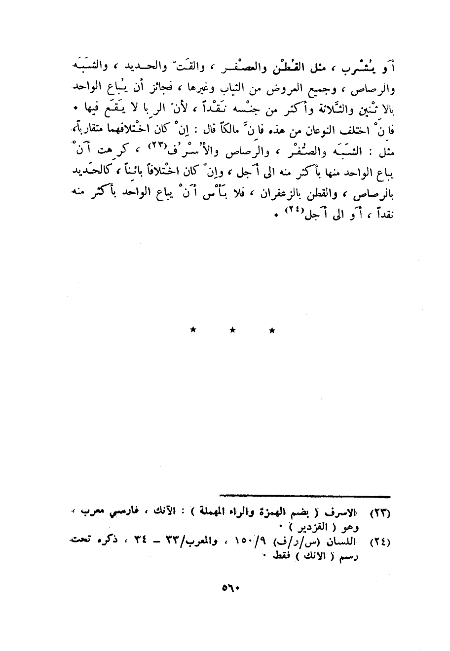 أَو يشرب مثل الْقطن والعصفر والقت وَالْحَدِيد والشبه والرصاص وَجَمِيع الْعرُوض من الثِّيَاب وَغَيرهَا فَجَائِز أَن يُبَاع الْوَاحِد بالاثنين وَالثَّلَاثَة وَأكْثر من جنسه نَقْدا لِأَن الرِّبَا لَا يَقع فِيهَا. فان اخْتلف النوعان من هَذِه فان مَالِكًا قَالَ: ان كَانَ اخْتِلَافهمَا متقاربا مثل: الشّبَه والصفر والرصاص والأسرف كرهت أَن يُبَاع الْوَاحِد مِنْهَا بِأَكْثَرَ مِنْهُ الى أجل وان كَانَ اخْتِلَافا بَائِنا كالحديد بالرصاص والقطن بالزعفران فَلَا بَأْس أَن يُبَاع الْوَاحِد بِأَكْثَرَ مِنْهُ نَقْدا أَو الى أجل.