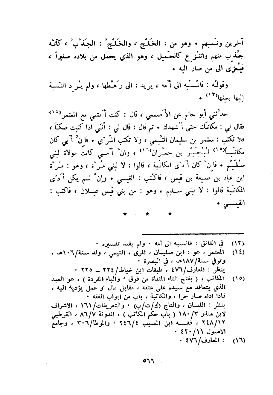حَدثنِي أَبُو حَاتِم عَن الْأَصْمَعِي قَالَ: كنت أَمْشِي مَعَ الْمُعْتَمِر فَقَالَ لي: مَكَانك حَتَّى أشهك. ثمَّ قَالَ: قَالَ لي: أَنِّي اذا كتبت صكا فا تكْتب: مُعْتَمر بن سُلَيْمَان التَّيْمِيّ وَلَا تكْتب المري فان أبي كَانَ مكَاتبا لبجير بن حمْرَان وان أُمِّي كَانَت مولاة لبني سليم. فان كَانَ أدّى الْمُكَاتبَة قَالُوا: لَا لبني مرّة وَهُوَ: مرّة ابْن عباد بن صبيعة بن قيس فَاكْتُبْ: الْقَيْسِي. وان لم يكن أدّى الْمُكَاتبَة قَالُوا: لَا لبني سليم وَهُوَ: من بني قيس عيلان فَاكْتُبْ: الْقَيْسِي.