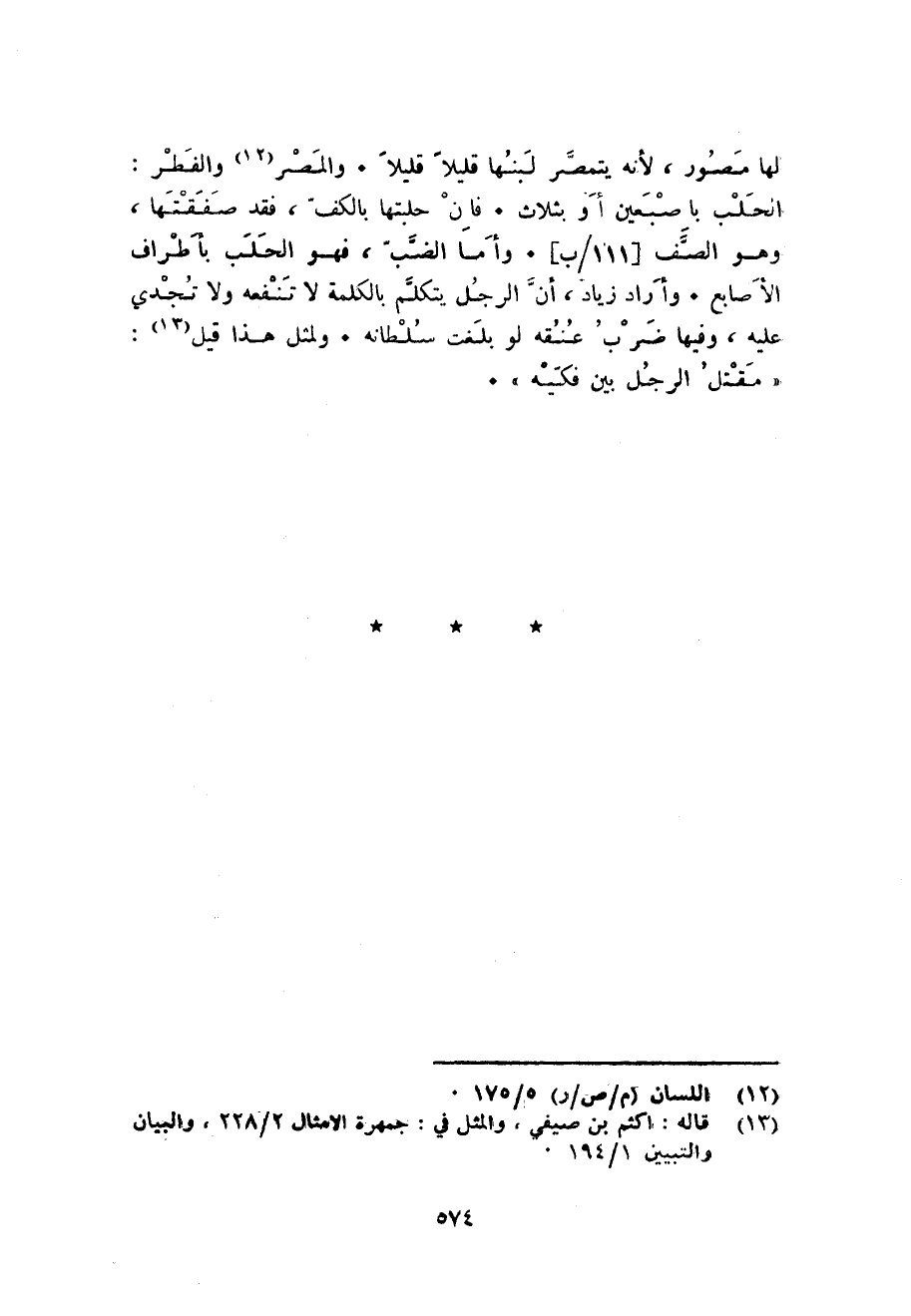 لَهَا مُصَور لِأَنَّهُ يتمصر لَبنهَا قَلِيلا قَلِيلا. والمصر وَالْفطر: الْحَلب باصبعين أَو بِثَلَاث. فان حلبتها الْكَفّ فقد صفقتها وَهُوَ الصَّفّ. وَأما الضَّب فَهُوَ الْحَلب بأطراف الْأَصَابِع. وَأَرَادَ زِيَاد أَن الرجل يتَكَلَّم بِالْكَلِمَةِ لَا تَنْفَعهُ وَلَا تجدي عَلَيْهِ وفيهَا ضرب عُنُقه لَو بلغت سُلْطَانه. ولمثل هَذَا قيل: مقتل الرجل بَين فَكَّيْهِ.