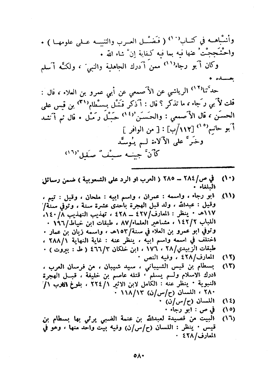 حَدثنَا الرياشي عَن الْأَصْمَعِي عَن أبي عَمْرو بن الْعَلَاء قَالَ: قلت لأبي رَجَاء مَا تذكر قَالَ: أذكر قتل بسطَام بن قيس على الْحسن قَالَ الْأَصْمَعِي: وَالْحسن حَبل رمل. قَالَ ثمَّ أنْشد أَبُو حَاتِم: من الوافر ... وخر على الألاءة لم يوسد ... كَأَن حبينه سيف صقيل ...