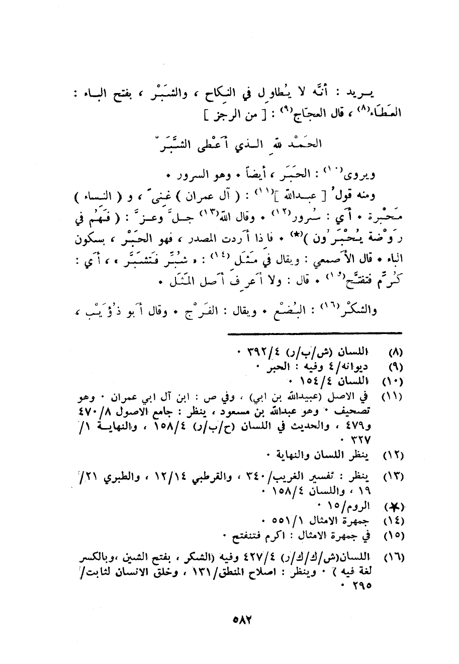 يُرِيد: أَنه لَا يطاول فِي النِّكَاح والشبر بِفَتْح الْبَاء: الْعَطاء قَالَ العجاج: من الرجز ... الْحَمد لله الَّذِي أعْطى الشبر ...