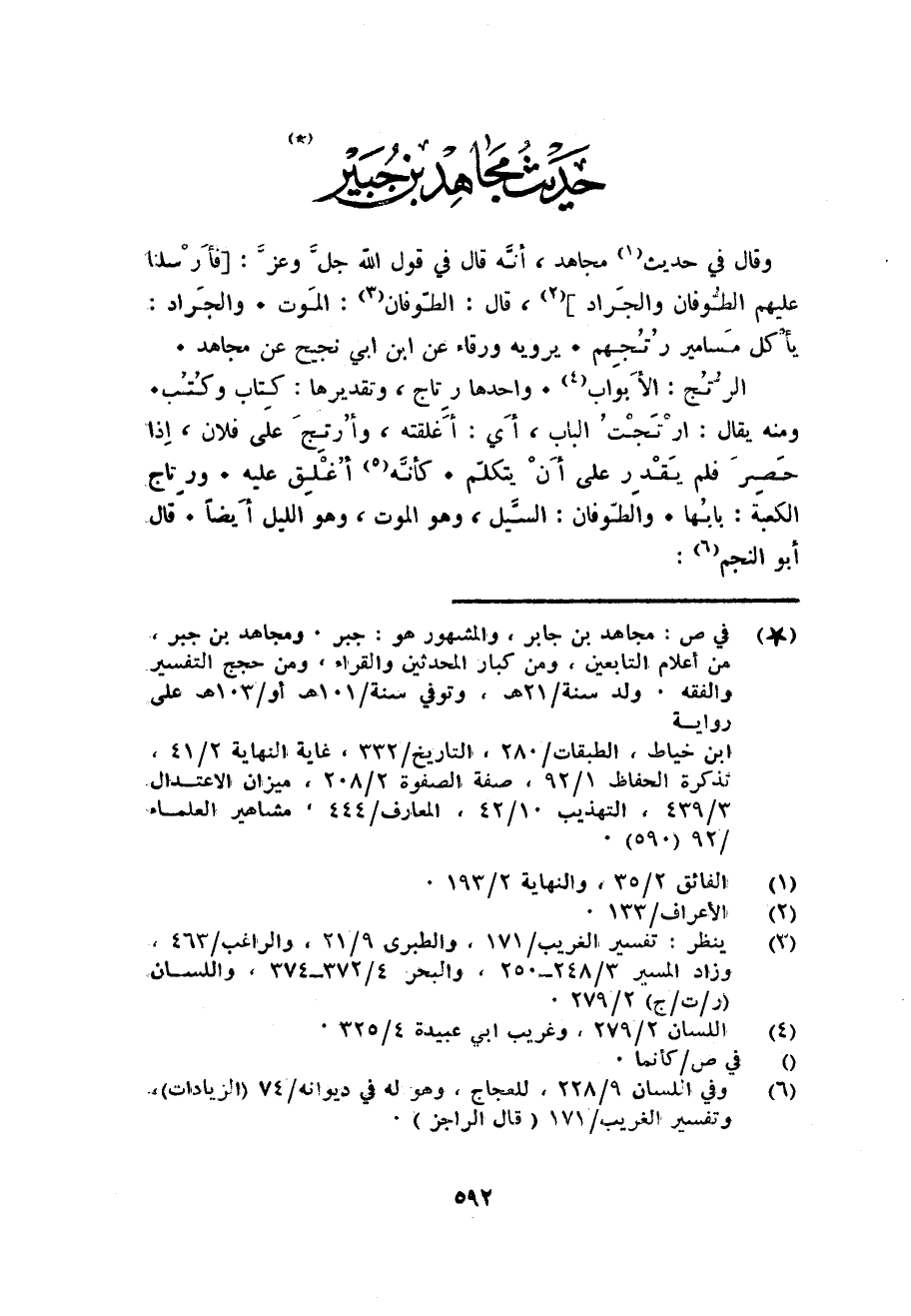 وَقَالَ فِي حَدِيث مُجَاهِد أَنه قَالَ فِي قَول الله جلّ وَعز: {فَأَرْسَلنَا عَلَيْهِم الطوفان وَالْجَرَاد} قَالَ الطوفان: الْمَوْت. الْجَرَاد: يَأْكُل مسامير رتجهم. يرويهِ وَرْقَاء عَن ابْن ابي نجيح عَن مُجَاهِد الرتج: الْأَبْوَاب. وَاحِدهَا ر تَاج وتقديرها: كتاب وَكتب. وَمِنْه يُقَال: ارتجت الْبَاب أَي: أغلقته وأرتج على فلَان اذا حصر فَلم يقدر على أَن يتَكَلَّم. كَأَنَّهُ أغلق عَلَيْهِ. ورتاج الْكَعْبَة: بَابهَا. والطوفان: السَّيْل وَهُوَ الْمَوْت وَهُوَ اللَّيْل أَيْضا. قَالَ أَبُو النَّجْم: