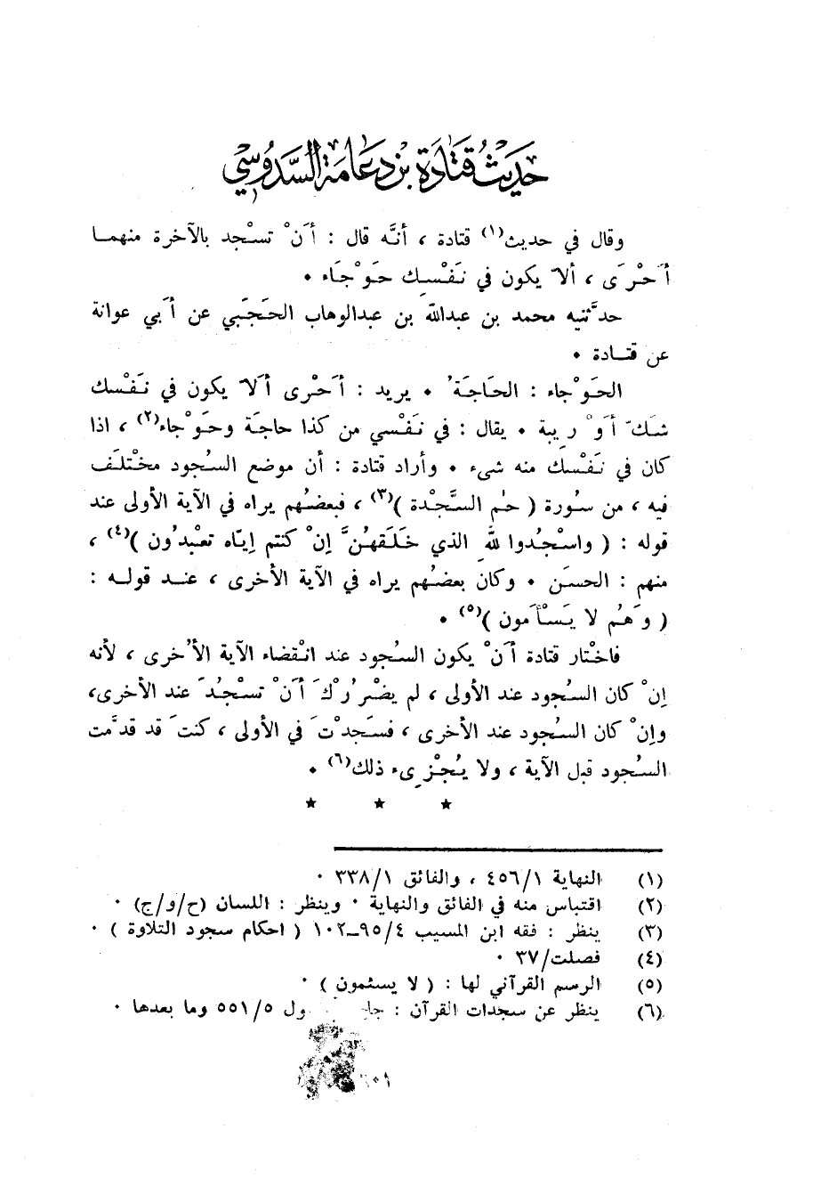 الحوجاء: الْحَاجة. يُرِيد: أَحْرَى أَلا يكون فِي نَفسك شكّ اَوْ رِيبَة. يُقَال: فِي نَفسِي من كَذَا حَاجَة وحوجاء اذا كَانَ فِي نَفسك مِنْهُ شىء. وَأَرَادَ قَتَادَة: أَن مَوضِع السُّجُود مُخْتَلف فِيهِ من سروة {حم} السَّجْدَة فبعضهم يرَاهُ فِي الْآيَة الأولى عِنْد قَوْله: {واسجدوا لله الَّذِي خَلقهنَّ إِن كُنْتُم إِيَّاه تَعْبدُونَ} مِنْهُم: الْحسن. وَكَانَ بَعضهم يرَاهُ فِي الْآيَة الْأُخْرَى عِنْد قَوْله: {وهم لَا يسأمون} .