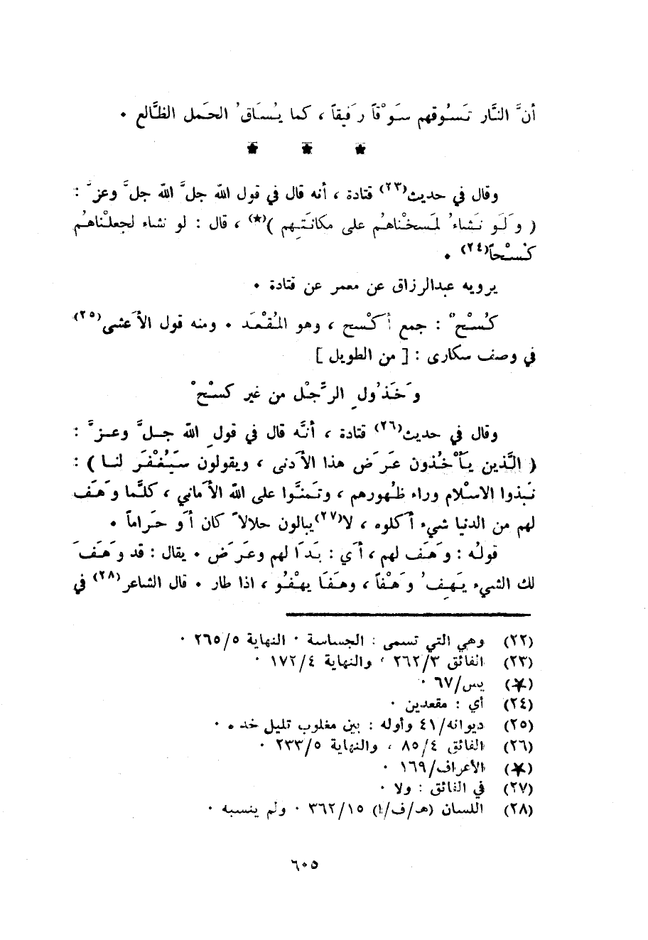 وَقَالَ فِي حَدِيث قَتَادَة أَنه قَالَ فِي قَول الله جلّ الله جلّ وَعز: {وَلَو نشَاء لمسخناهم} على مكانتهم قَالَ: لَو نشَاء لجعلناهم كسحا.