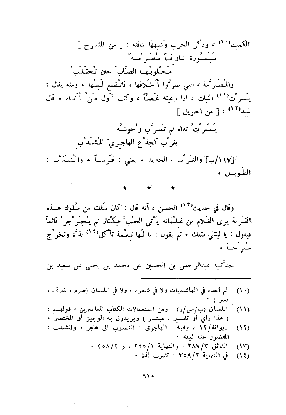 والمصرمة الَّتِي صروا أخلافها فَانْقَطع لَبنهَا. وَمِنْه يُقَال: بسرت النَّبَات اذا رَعيته غضا وَكنت أول من أَتَاهُ. قَالَ لبيد: من الطَّوِيل ... بسرت نداه لم تسرب وحوشه ... بغرب كجذع الهاجري المشذب ...