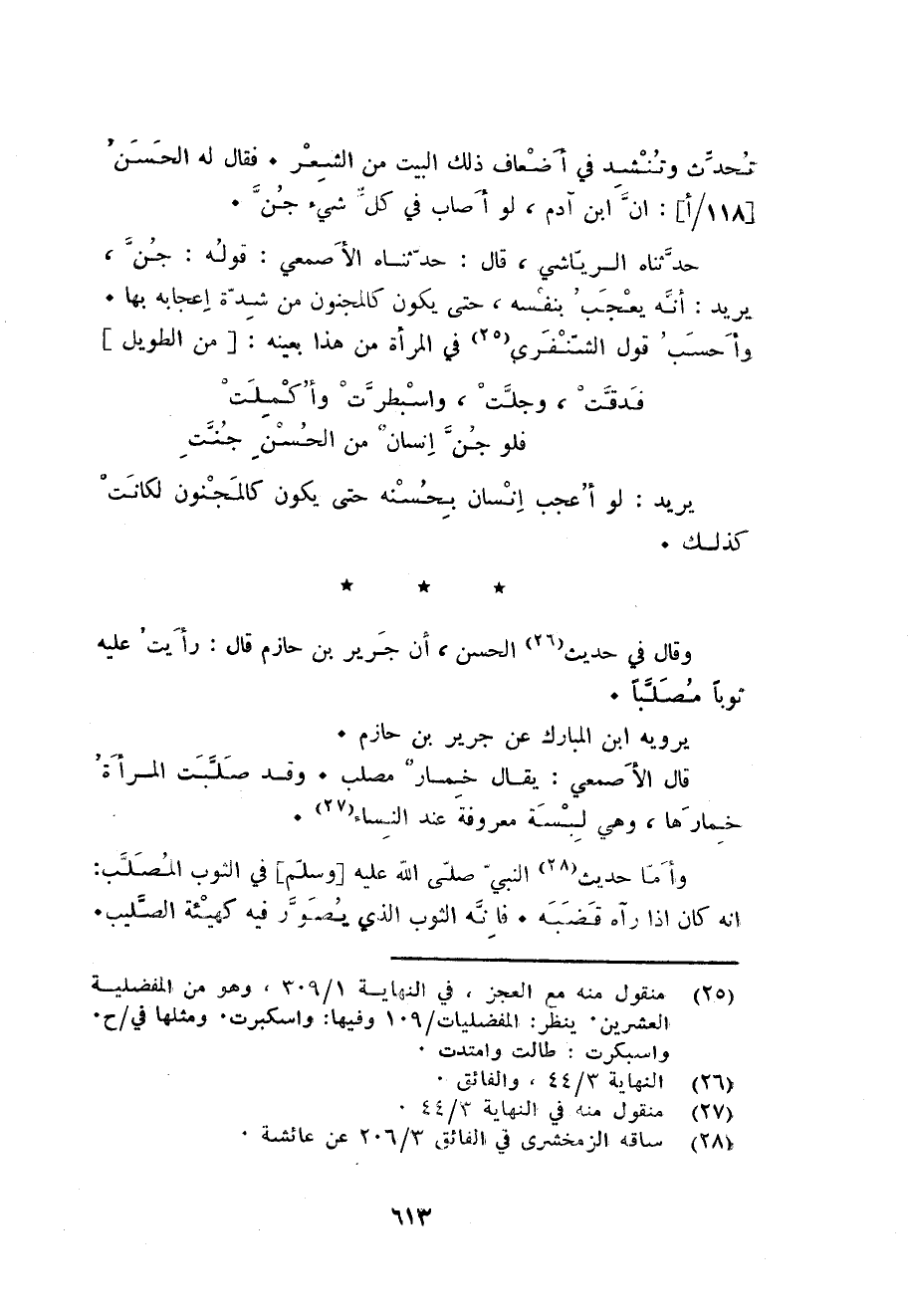 حدّثنَاهُ الرياشي قَالَ: حدّثنَاهُ الْأَصْمَعِي: قَوْله: جن يُرِيد: أَنه يعجب بِنَفسِهِ حَتَّى يكون كَالْمَجْنُونِ من شدَّة اعجابه بهَا. وأحسب قَول الشنفرى فِي الْمَرْأَة من هَذَا بِعَيْنِه: من الطَّوِيل ... فدقت وجلت واسبطرت وأكملت ... فَلَو وجن انسان من الْحسن جنت ...