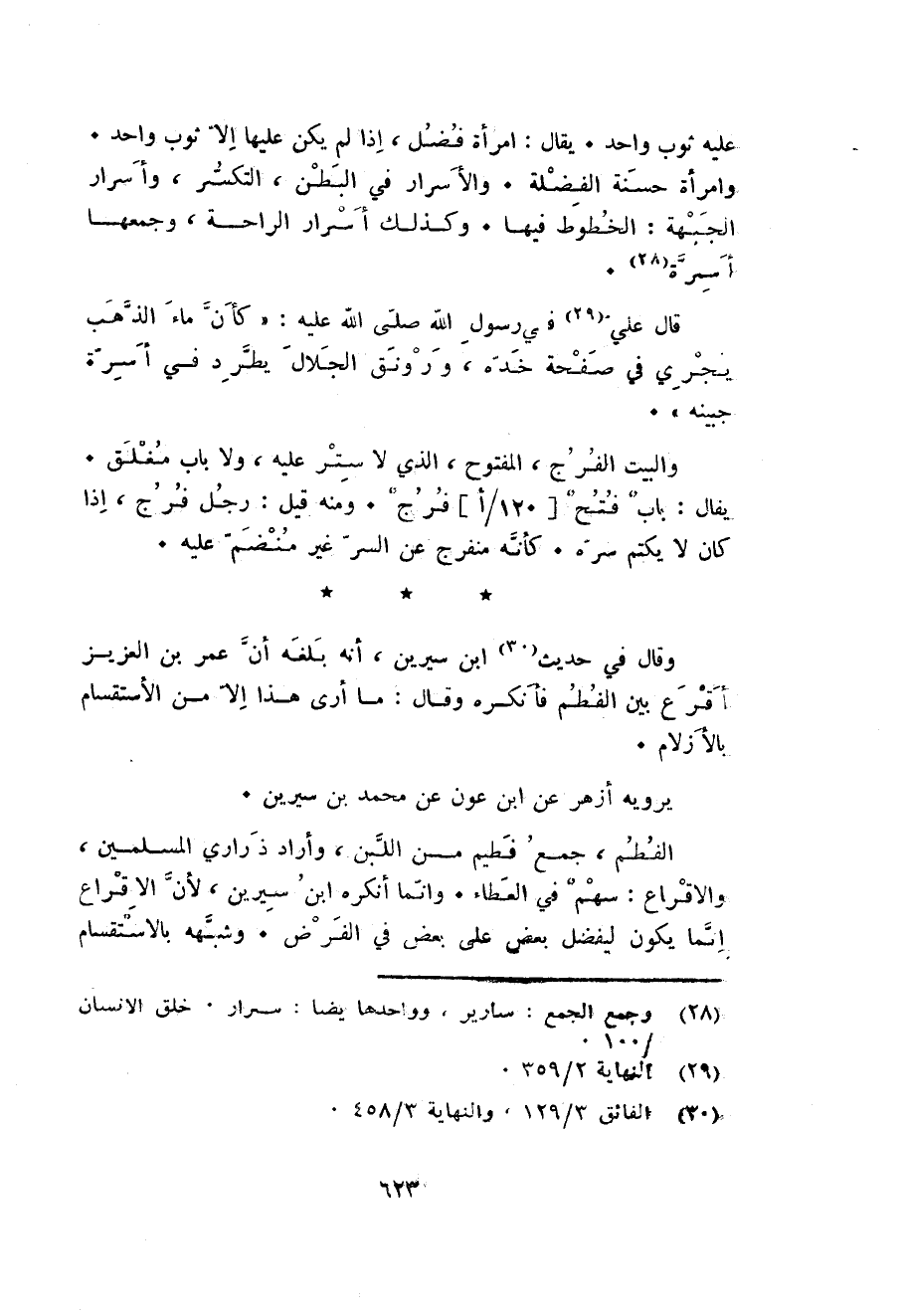 عَلَيْهِ ثوب وَاحِد. يُقَال: امْرَأَة فضل اذا لم يكن عَلَيْهَا الا ثوب وَاحِد وَامْرَأَة حَسَنَة الفضلة. والأسرار فِي الْبَطن التكسر وأسرار الْجَبْهَة: الخطوط فِيهَا. وَكَذَلِكَ أسرار الرَّاحَة وَجَمعهَا أسرة.
