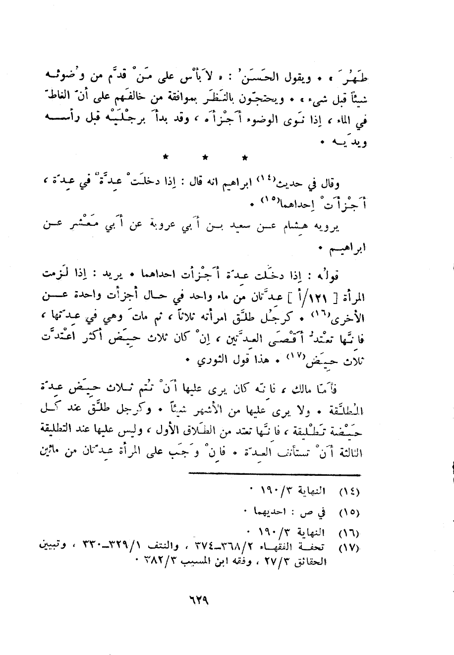 فَأَما مَالك فانه كَانَ يرى عَلَيْهَا أَن تتمّ ثَلَاث حيض عدَّة الْمُطلقَة. وَلَا يرى عَلَيْهَا من الْأَشْهر شَيْئا. وكرجل طلق عِنْد كل حَيْضَة تَطْلِيقَة فانها تَعْتَد من الطَّلَاق الأول وَلَيْسَ عَلَيْهَا عِنْد التطليقة الثَّالِثَة أَن تسأنف الْعدة. فان وَجب على الْمَرْأَة عدتان من مائين.