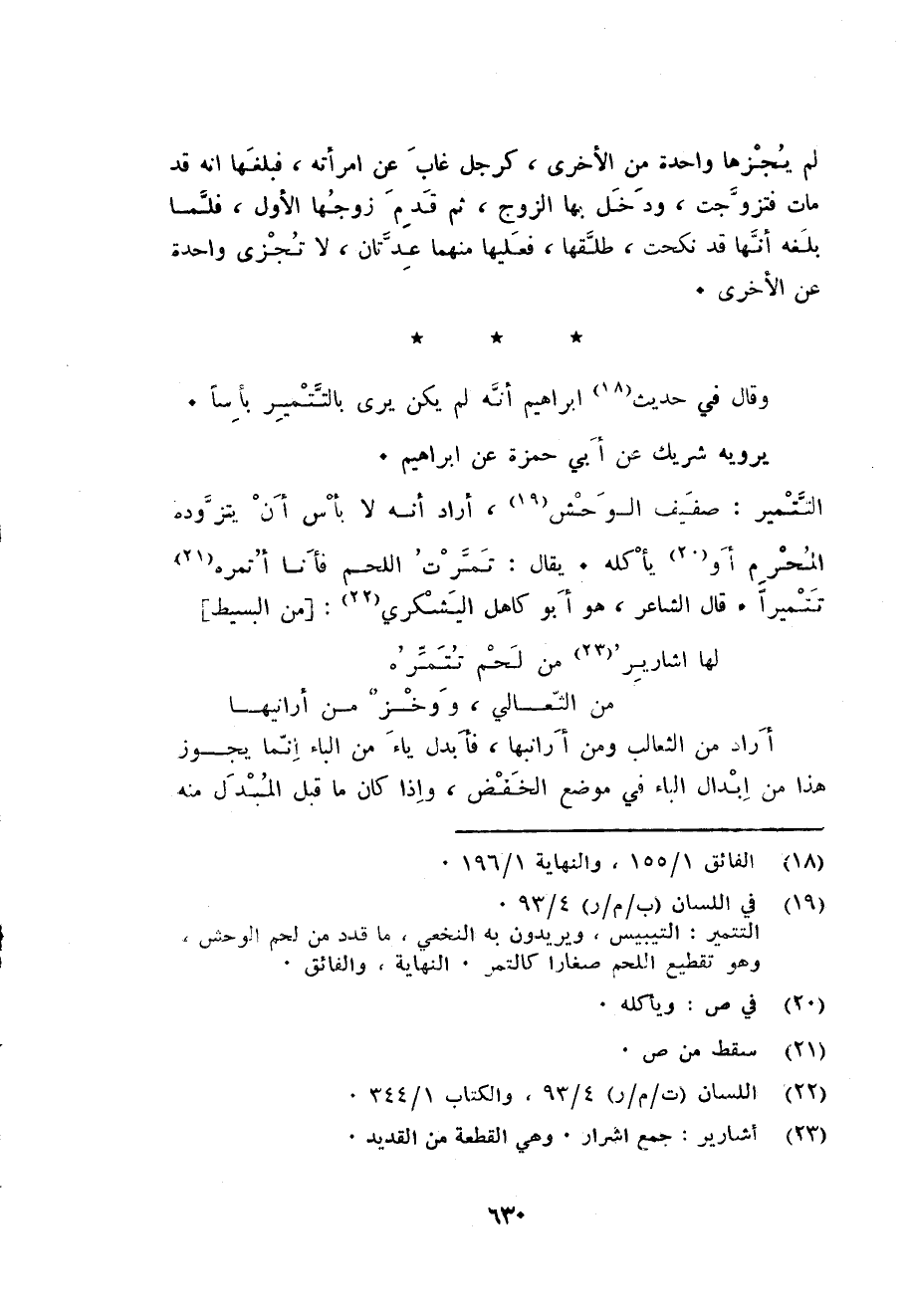 التتمير: صفيف الْوَحْش أرادر أَنه لَا بَأْس أَن يتزوده الْمحرم أَو يَأْكُلهُ. يُقَال: تمرت اللَّحْم فَأَنا أتمره تتميرا. قَالَ الشَّاعِر وَهُوَ أَبُو كَاهِل الْيَشْكُرِي: من الْبَسِيط ... لَهَا اشارير من لحم تتمره ... من الثعالي ووخز من أرانيها ...
