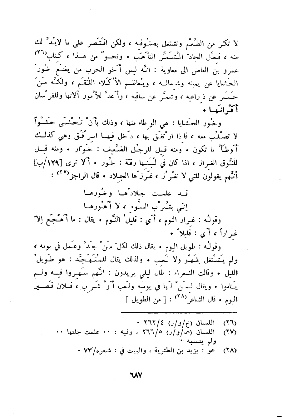 وخور الحشايا: هِيَ الوطاء مِنْهَا وَذَلِكَ بِأَن تحشى حَشْوًا لَا تصلب مَعَه فَإِذا ارتفق بهَا دخل فِيهَا الْمرْفق وَهِي كَذَلِك أوطأ مَا تكون. وَمِنْه قيل للرجل الضَّعِيف: خوار. وَمِنْه قيل للنوق الغزاز إِذا كَانَ فِي لَبنهَا رقة: خور. أَلا ترى أَنهم يَقُولُونَ للَّتِي لَا تغرز غرزها الجلاد. قَالَ الراجز: ... قد علمت جلادها وخورها ... إنى بِشرب السوء لَا أهورها ...