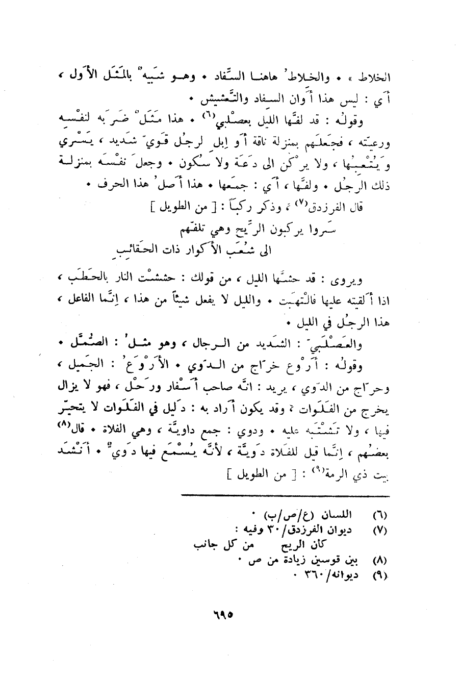 وَقَوله: قد لفها اللَّيْل بعصلبي. هَذَا مثل ضربه لنَفسِهِ ورعيته فجعلهم بِمَنْزِلَة نَاقَة أَو إبل لرجل قوي شَدِيد يسري ويتعبها وَلَا يركن إِلَى دعة وَلَا سُكُون. وَجعل نَفسه بِمَنْزِلَة ذَلِك الرجل. ولفها أَي: جمعهَا. هَذَا أصل هَذَا الْحَرْف.